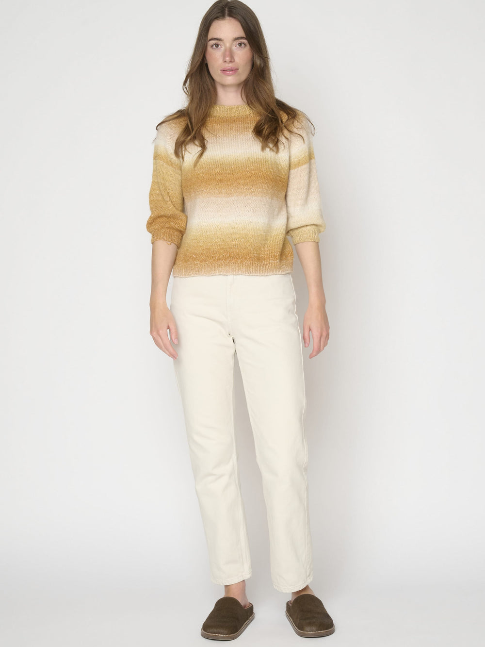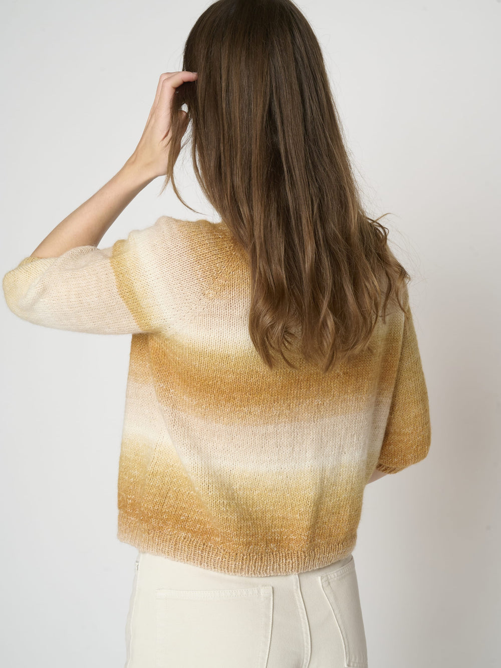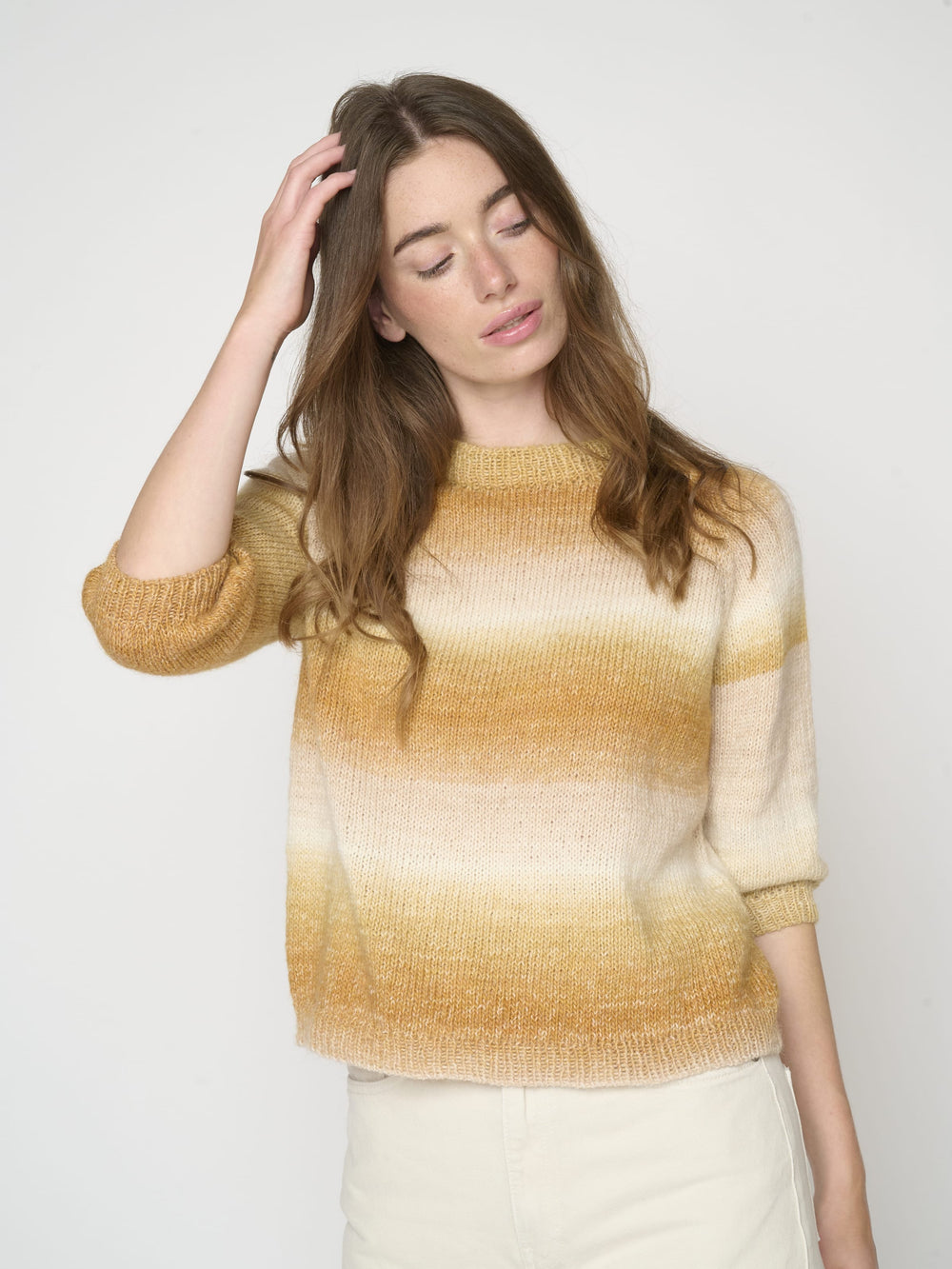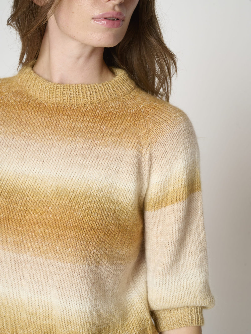 Blusens flotte farveskifte kommer helt af sig selv, da blusen strikkes i Mayflower Taormina Flow, som har det fineste farveforløb i graduerende nuancer. Garnet er en blød alpakablanding i samme fibersammensætning som Taormina og Taormina Shade.