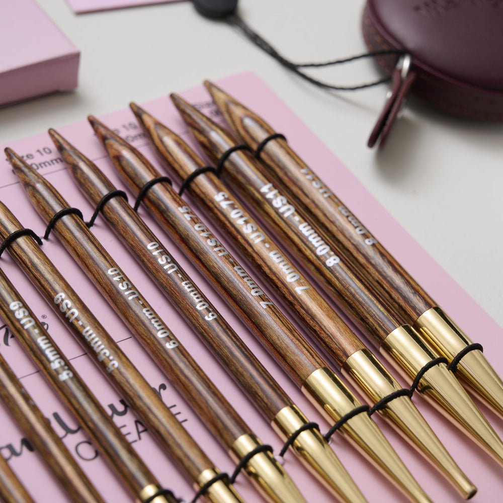 Det her sæt med udskiftelige rundpinde, kan kun fås hos Mayflower, som i samarbejde med KnitPro har udviklet et intuitivt og udskifteligt rundpindesæt. Et smukt sæt i lakeret birketræ med udskiftelige rundpinde, wirer, stoppere og strammenøgler. Pindene er komfortable at have i hånden, og garnet glider godt på den polerede overflade. Amber-sættet gør det nemt at have gang i flere projekter samtidig på forskellige størrelser pinde. Vær opmærksom på, at udskiftelige rundpinde og wirer fra alle KnitPro-serier passer sammen.