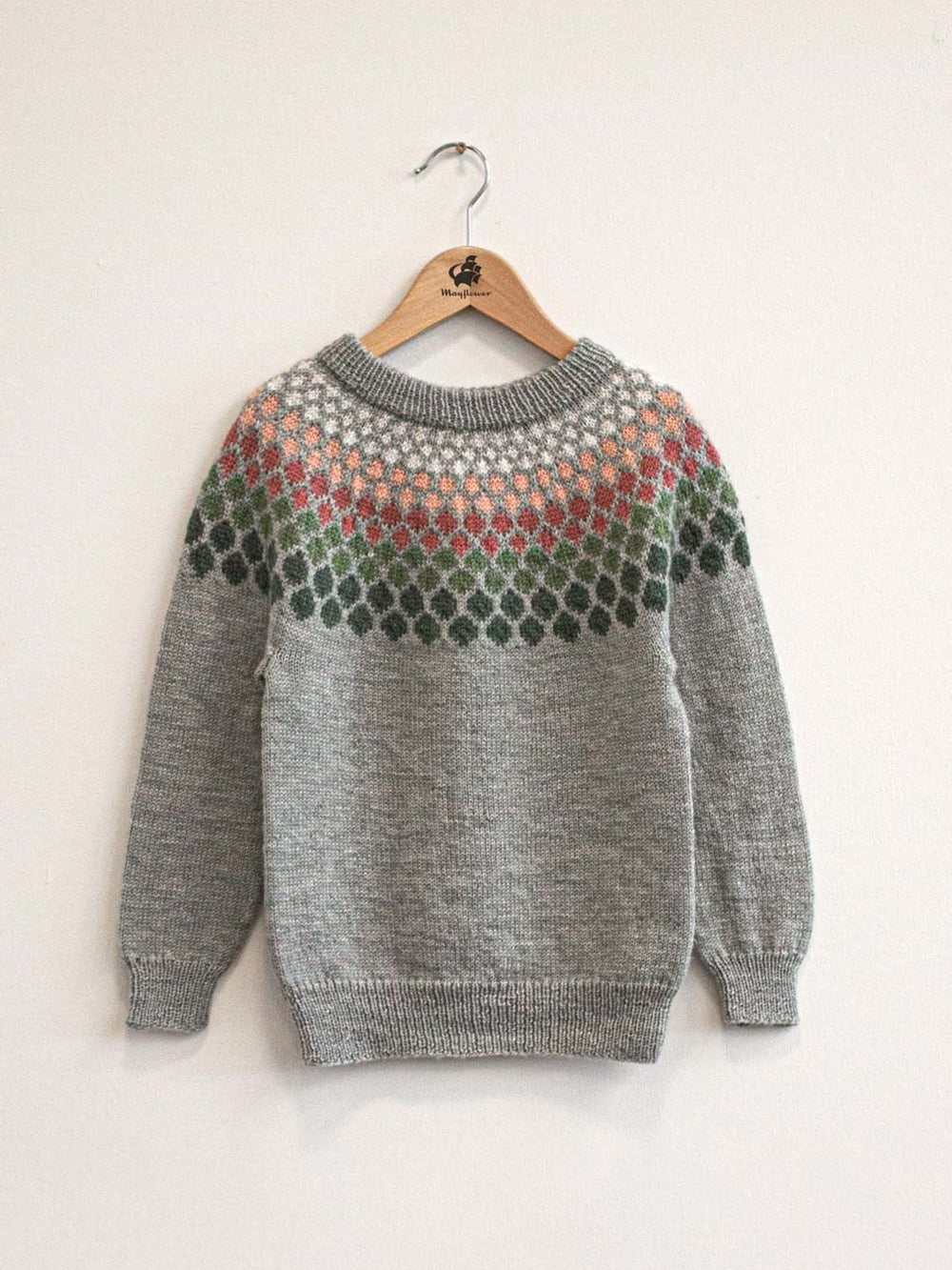 Børnesweateren, Dorthea sweater junior, er en fin, glatstrikket trøje med et flerfarvet, rundt mønster i bærestykket, som kan bruges hele året rundt.