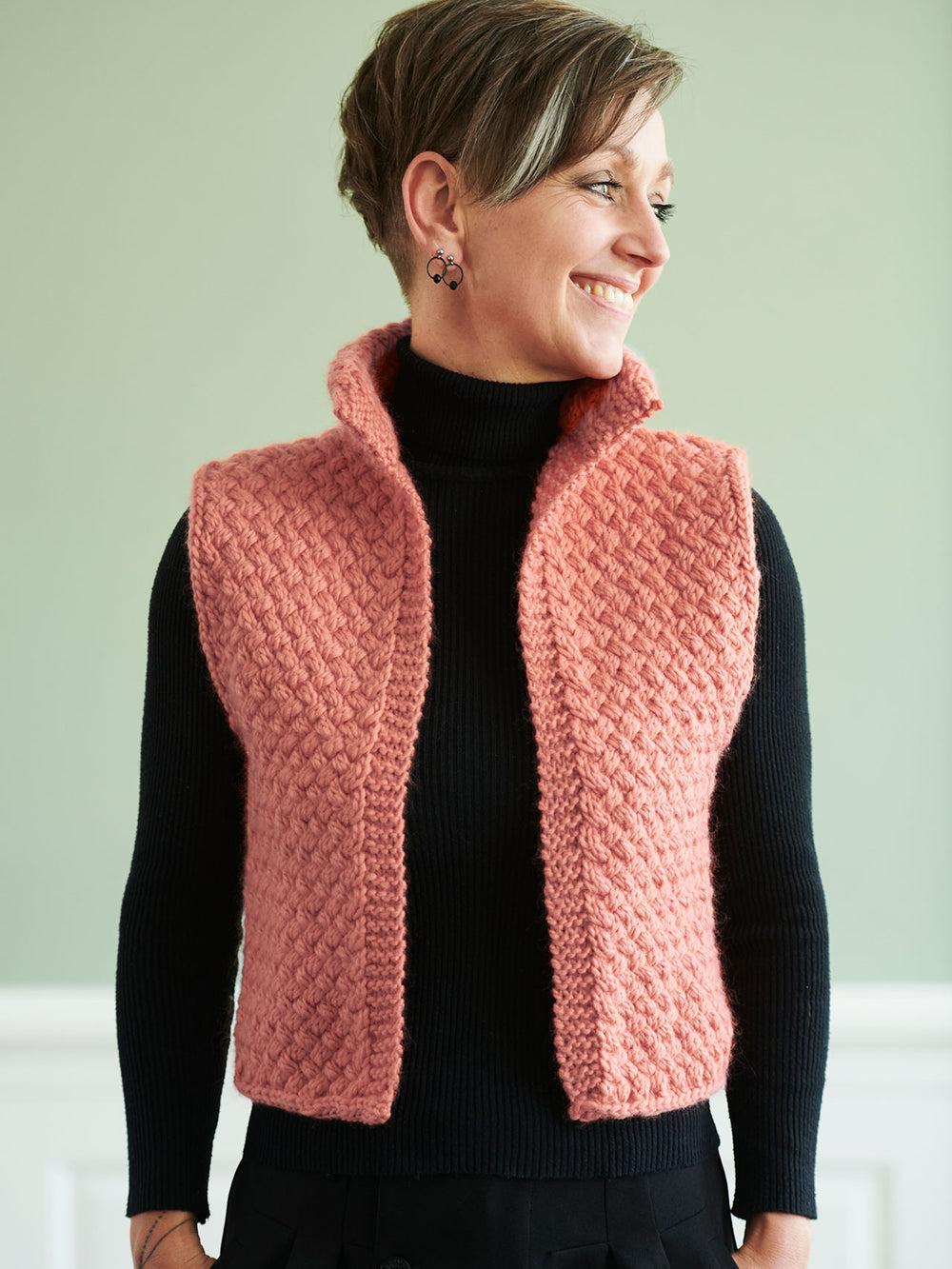 Flot vest i flettet mønster. Vesten har en høj krave og strikkes nedefra og op i Mayflower Molly Fine, som giver vesten et godt hold.