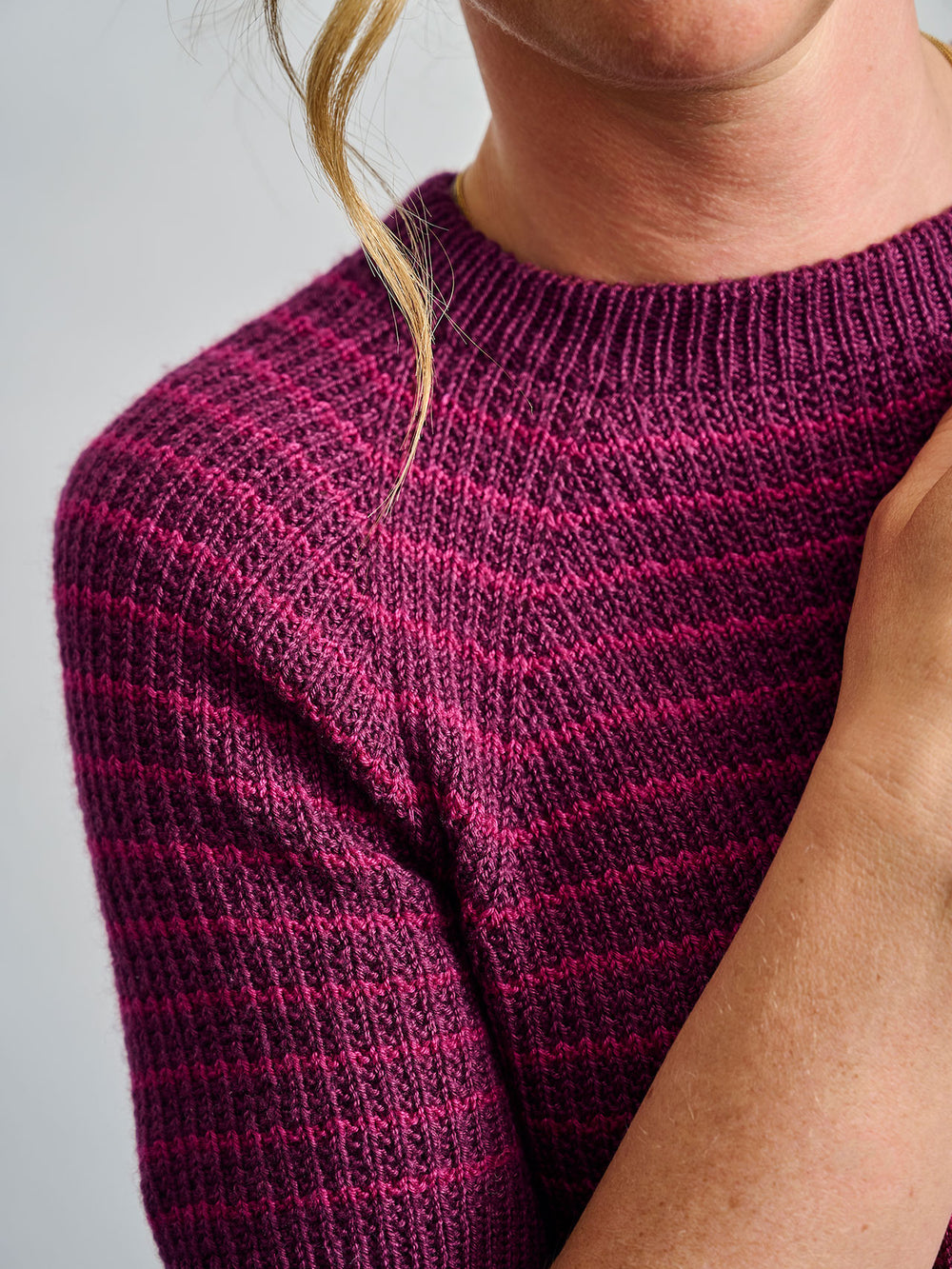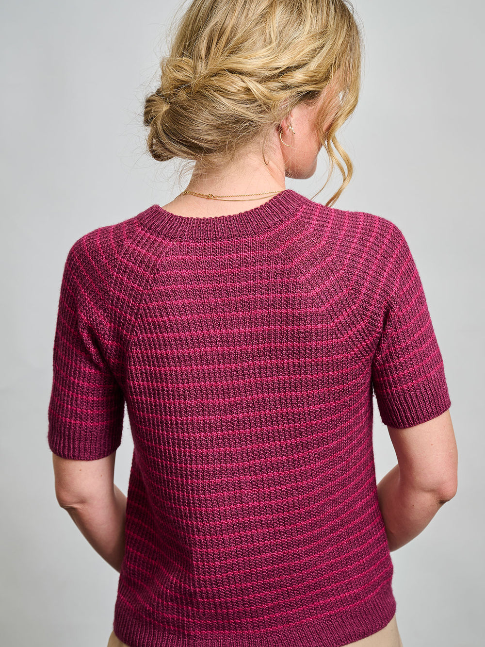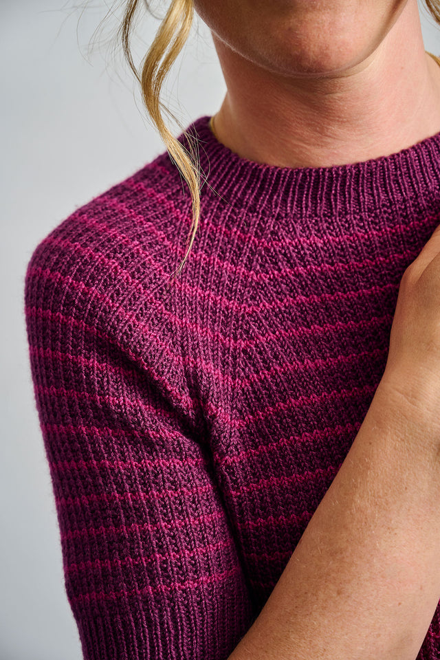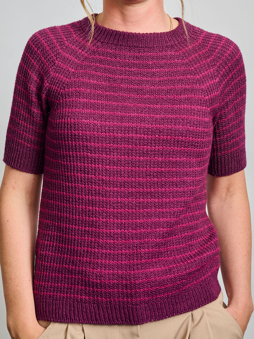 Den stribede Friday tee fra PetiteKnit er strikket topdown i perlerib og med raglanudtagninger i bærestykket.