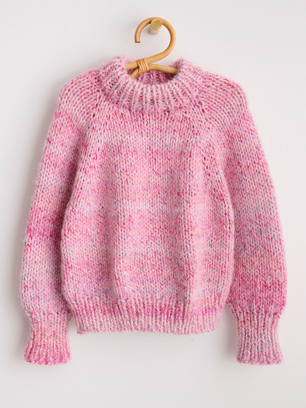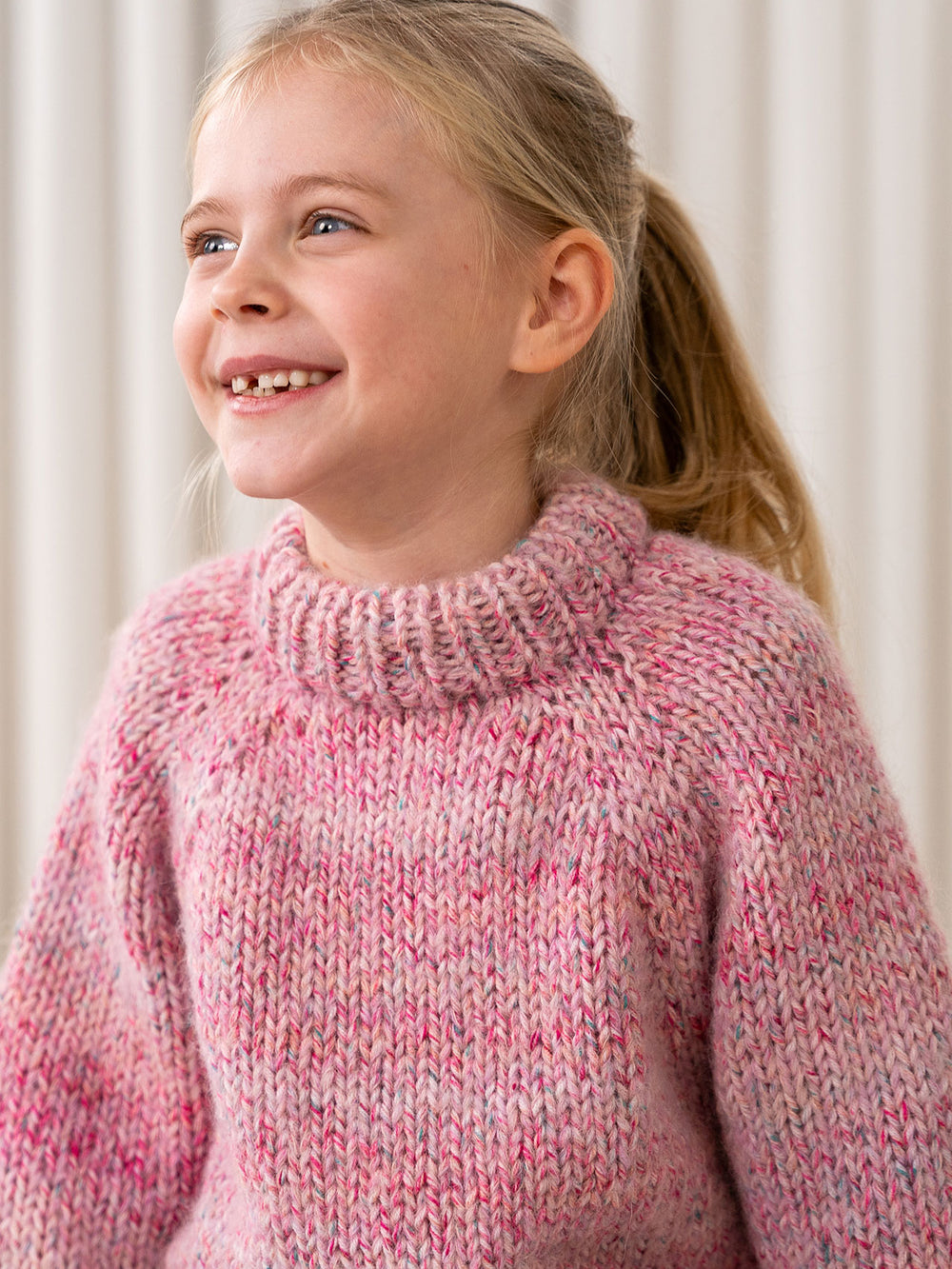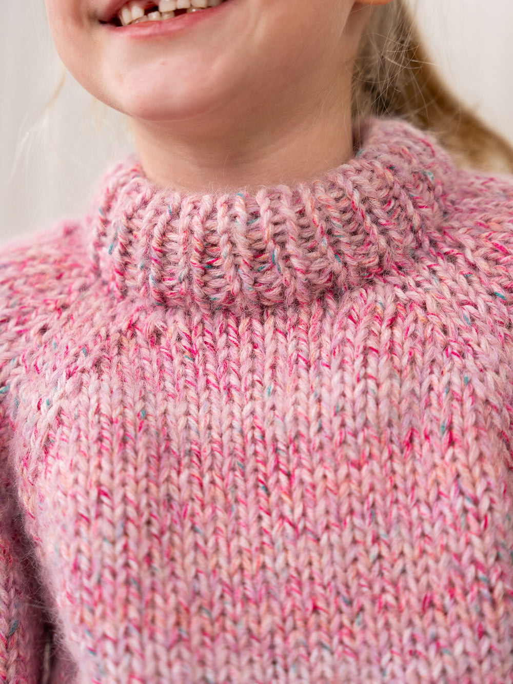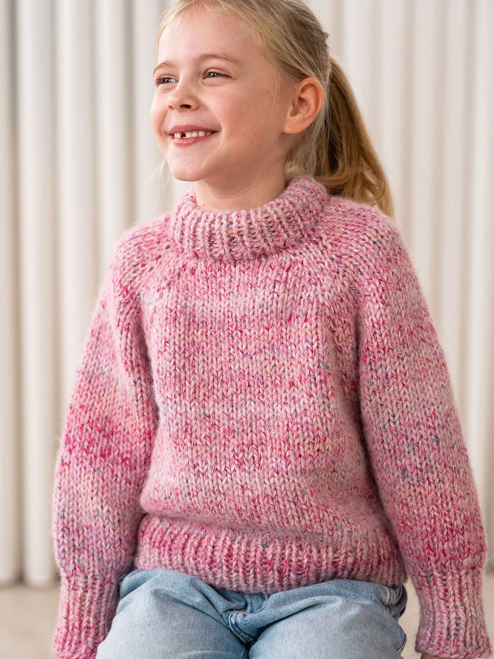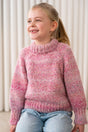 Marble sweater junior fra PetiteKnit strikkes oppefra og ned i glatstrik med raglanudtagninger i bærestykket. Kanterne strikkes i rib.