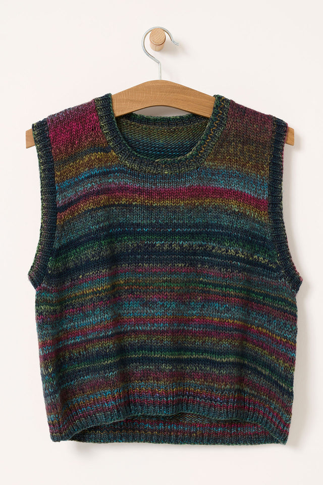 Slipoveren strikkes i det bløde og farverige Mayflower Premium Maxima, som er en eksklusiv garnkvalitet i ekstrafin merinould. Farverne skifter i flotte overgange. Vesten får en lækker fylde, da Maxima er et lidt tykt garn med en dejlig struktur og god lune.