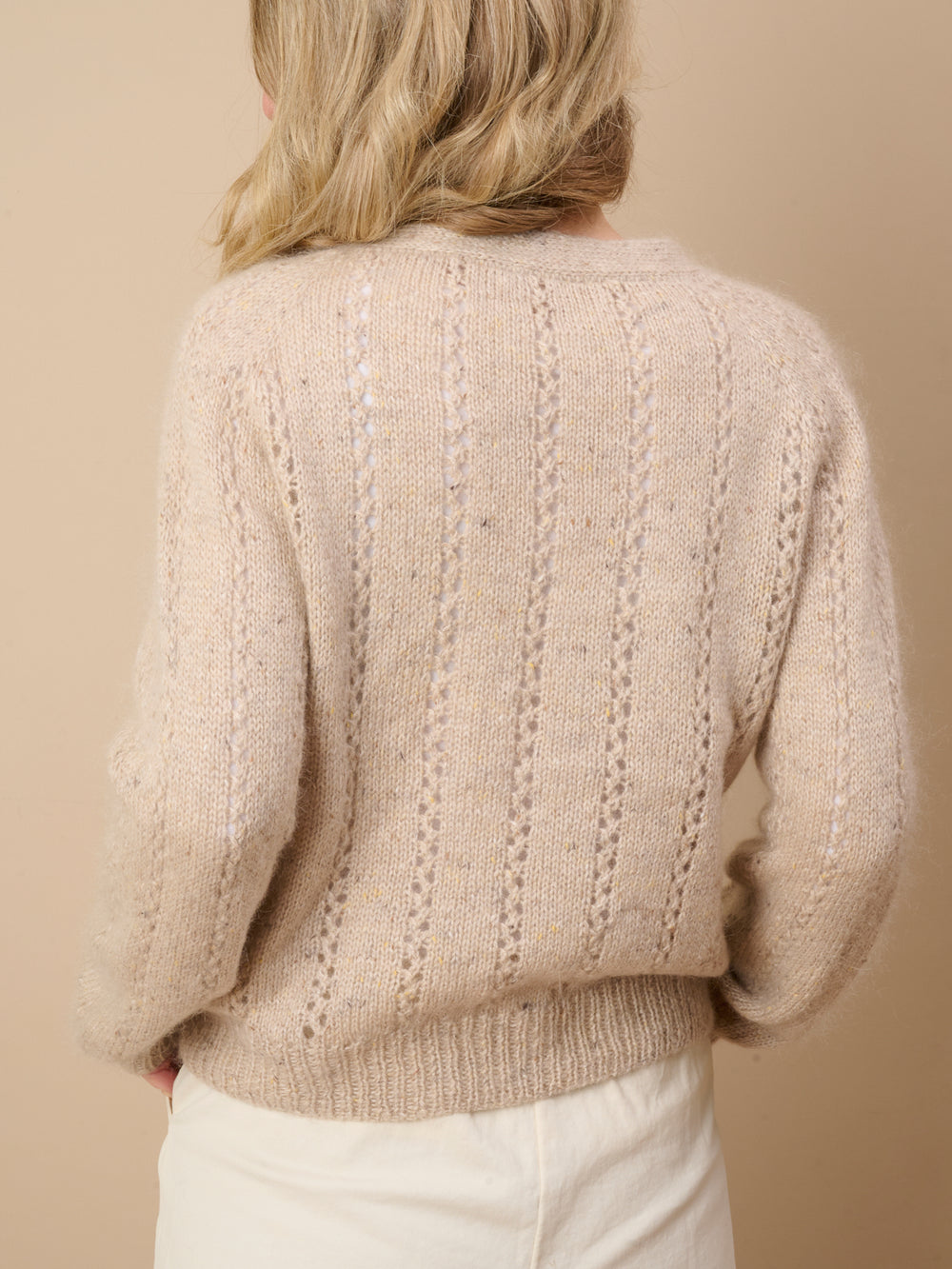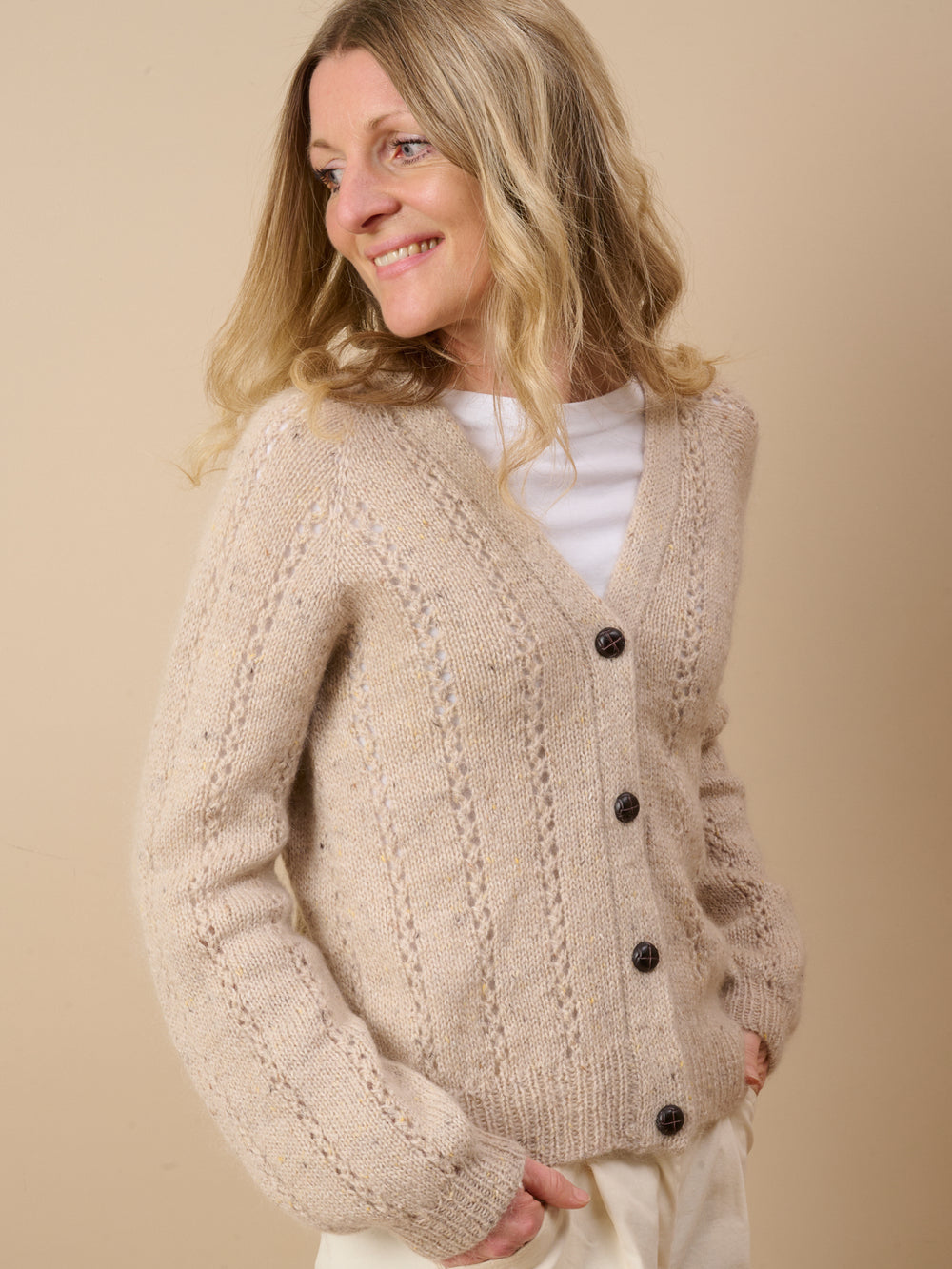 Odder cardigan er strikket i én tråd Mayflower Birmingham og én tråd Mayflower Super Kid Silk. Vores Birmingham er kendetegnet af et flot tweed-look, som gøres mere diskret og afdæmpet, når den kombineres med Super Kid Silk.