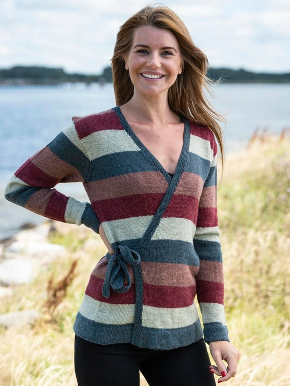 Feminin slå-om-bluse med brede striber, der giver et levende, sprælsk men stadig harmonisk udtryk, da farverne supplerer hinanden godt. Blusen har en dyb v-udskæring foran. Kanten på bullen samt bindebåndet er lavet i perlestrik. Ærmerne er påsatte og afsluttes med et glat ombuk, ligesom bullen er afsluttet med en glat, ombukket kant.
