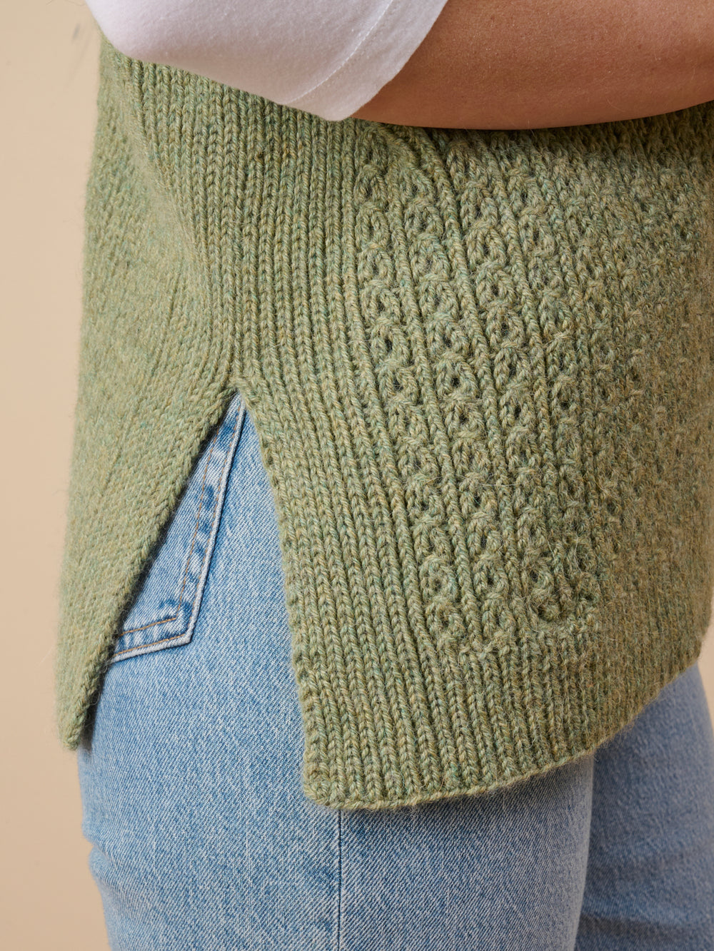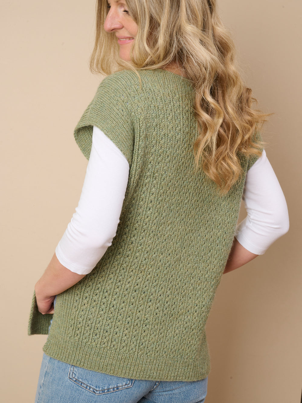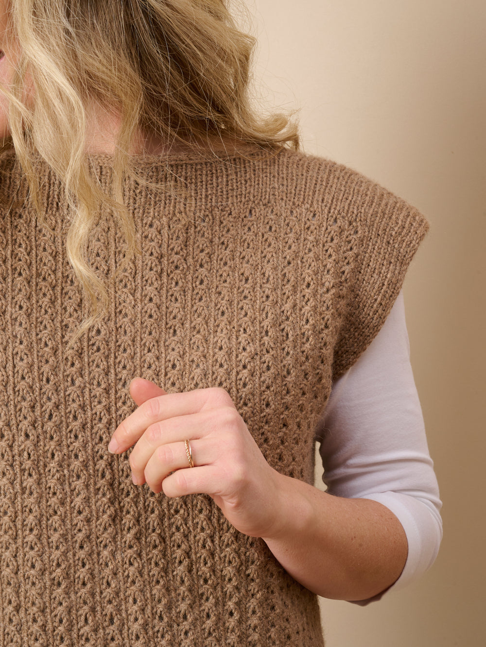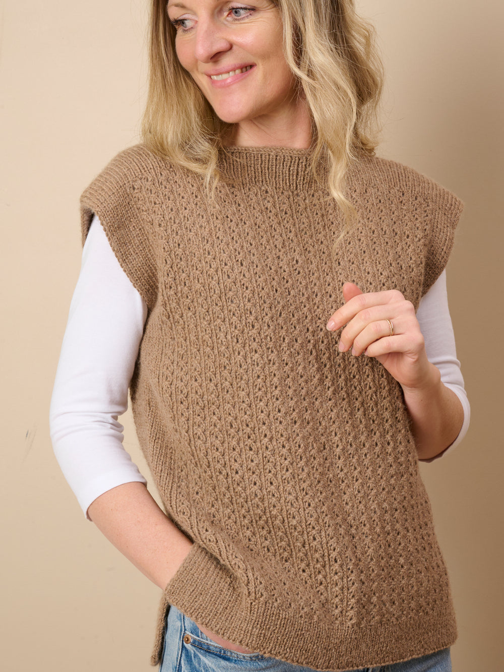 En smart vest med hulmønster, der er nem at gå til, da det er en enkel konstruktion. Sigrid vesten har en god pasform og falder pænt over skuldrene. Vesten laves oppefra og ned med udgangspunkt i en hæklet luftmaskekæde, hvor der strikkes videre fra luftmaskekæden. Først laves ryggen, så forstykket, herefter halskanten, og til sidst sys vestens sider sammen.