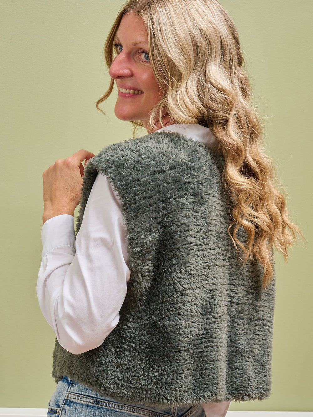 Vesten strikkes i pelsgarnet Mayflower More Fake Fur, og resultatet er virkelig blødt.