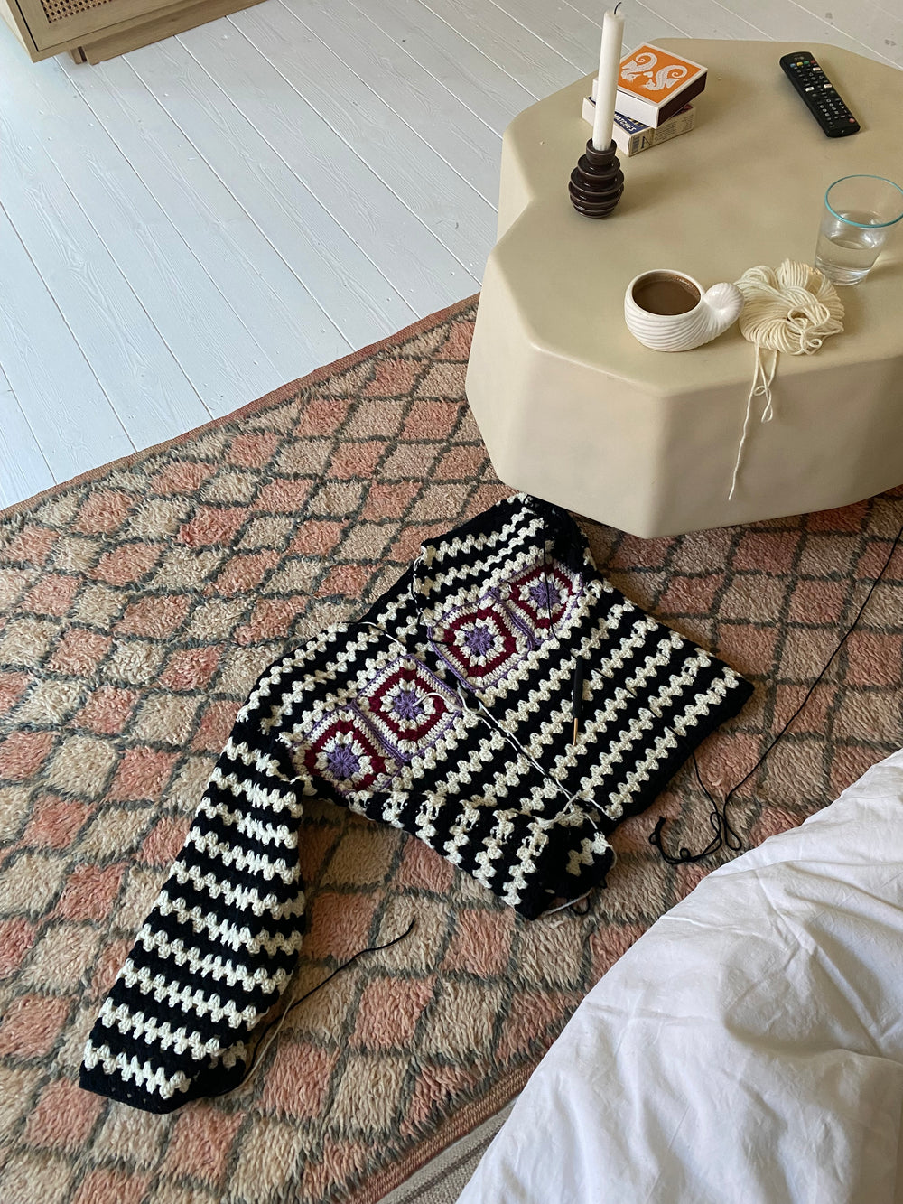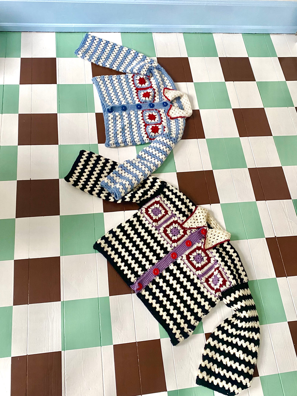 Chunky kardigan wykonany na szydełku z miękkiej wełny alpaki, idealny na zimowe miesiące lub jako lekka narzutka na chłodne letnie wieczory. Szydełkowany w klasycznym wzorze „granny stripes” – prostym i szybkim, który nadaje całości ciekawego, oldschoolowego wyglądu. Kardigan wykończony jest eleganckim kołnierzem i dużymi guzikami.