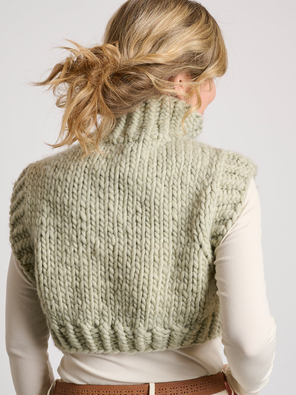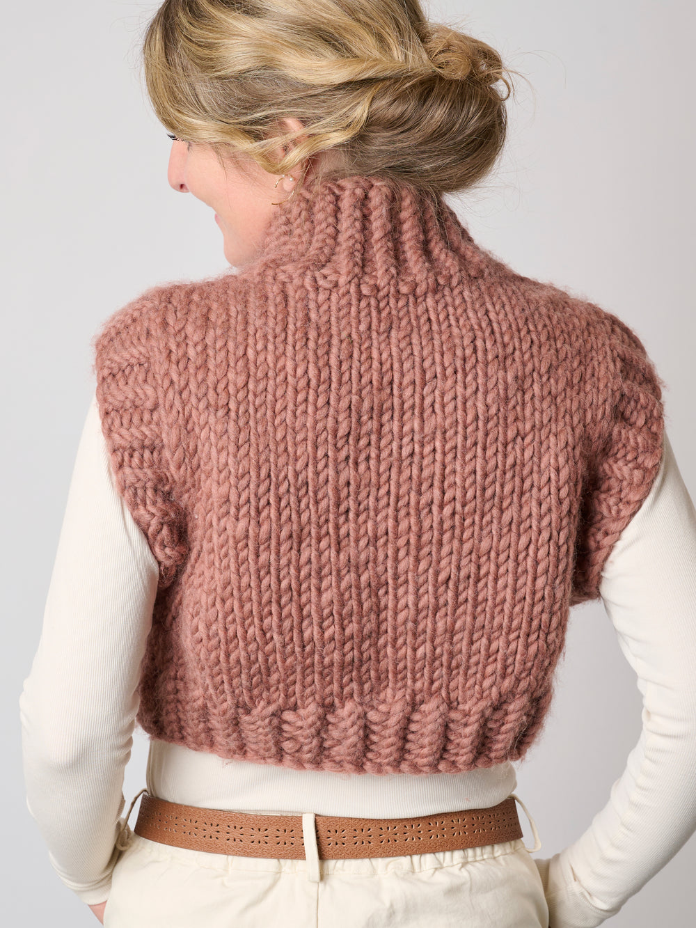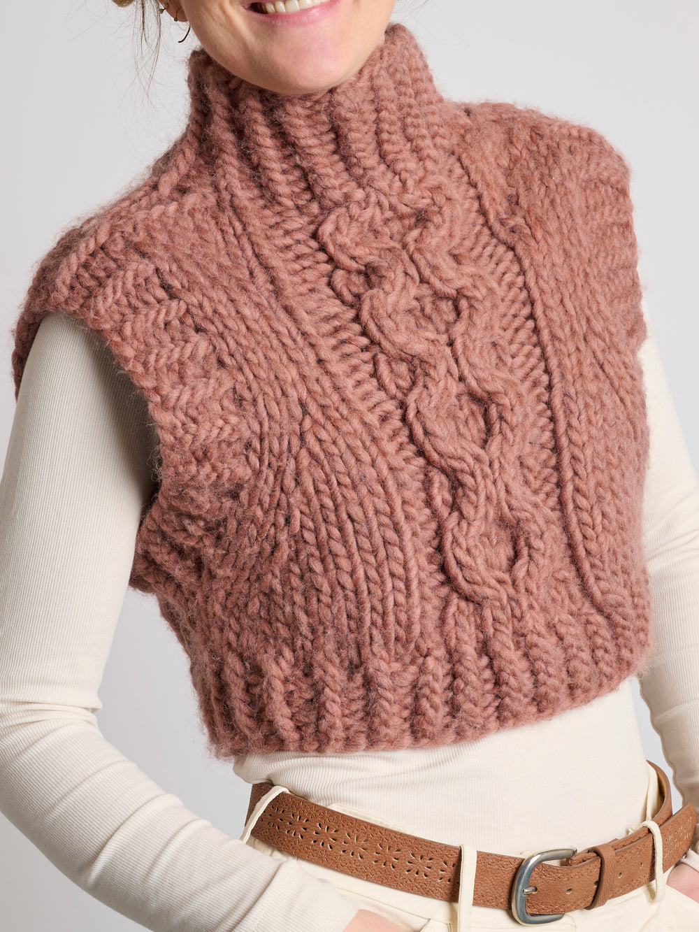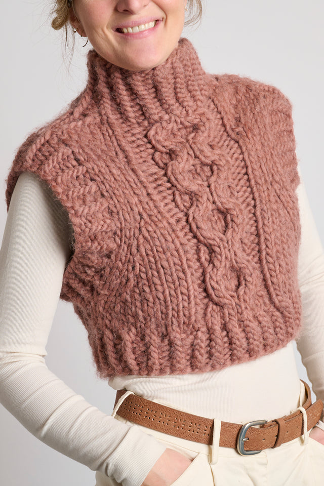 Ten uroczy bezrękawnik to ekscytujący projekt dziewiarski, który można szybko ukończyć. Kamizelka jest wykonana z szerokiego warkocza, który biegnie wzdłuż jej przedniej części. Dodatkowo wokół otworów na ramiona zastosowano ściągacz, co nadaje im dodatkową strukturę i sprawia, że kamizelka prezentuje się ciekawiej wizualnie. Alva to unikalny wzór dziewiarski – modny i łatwy do wykonania. Warkocz jest stosunkowo prosty, dlatego dziergając ten model, można świetnie poćwiczyć technikę robienia warkoczy na drutach.