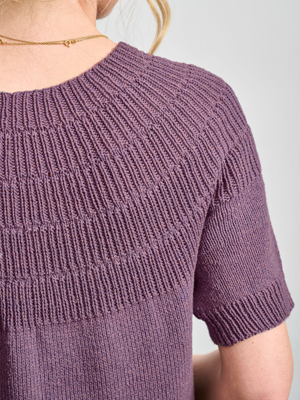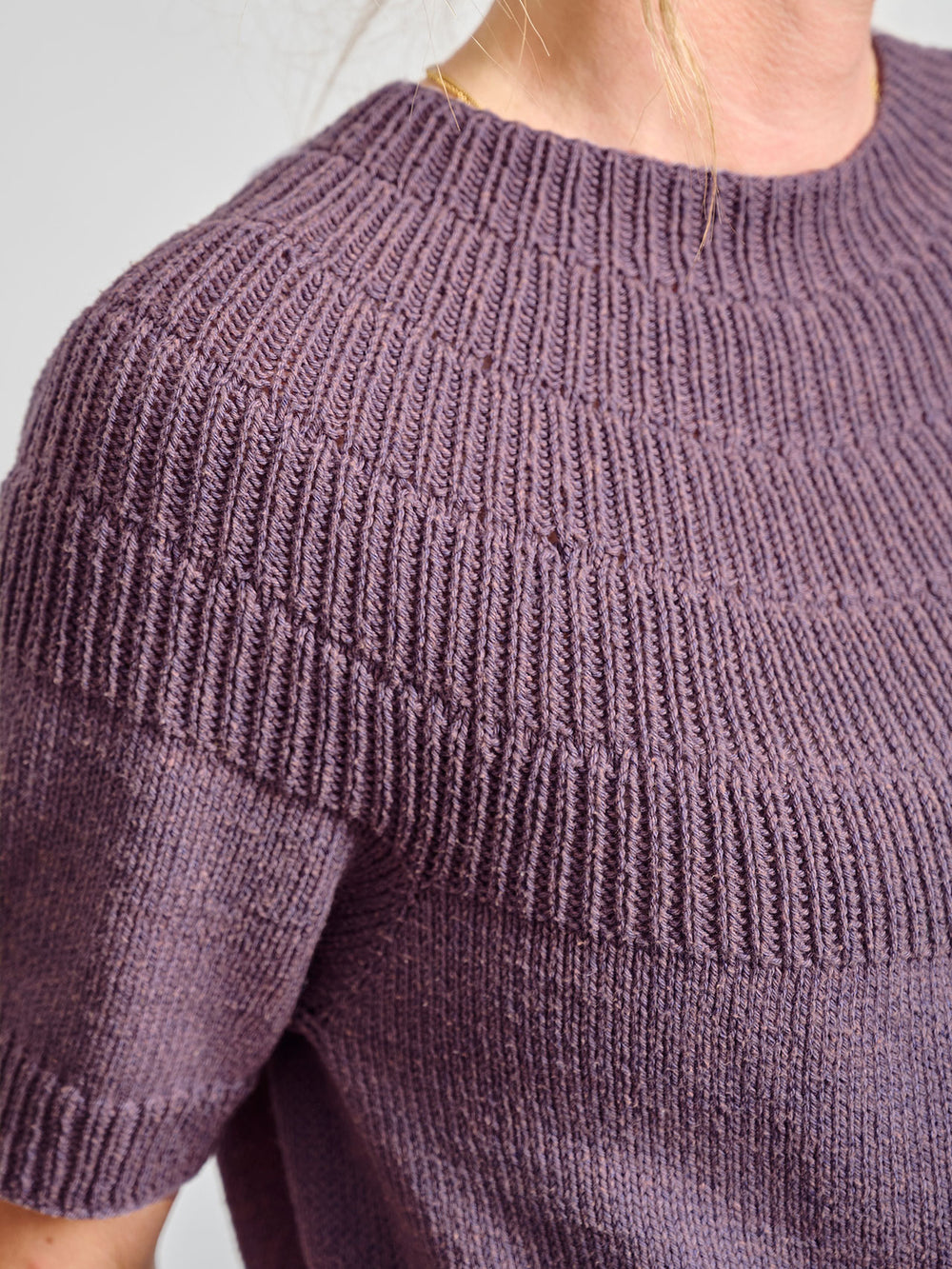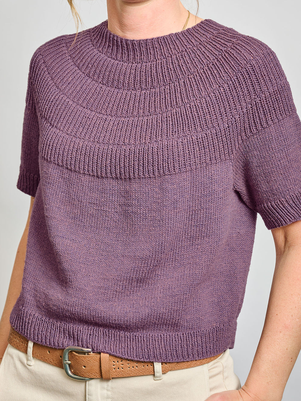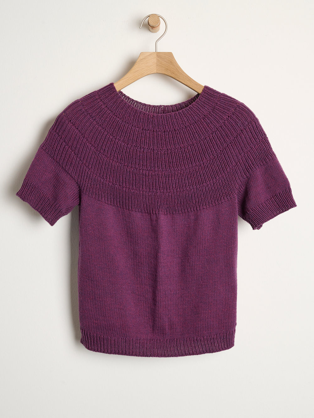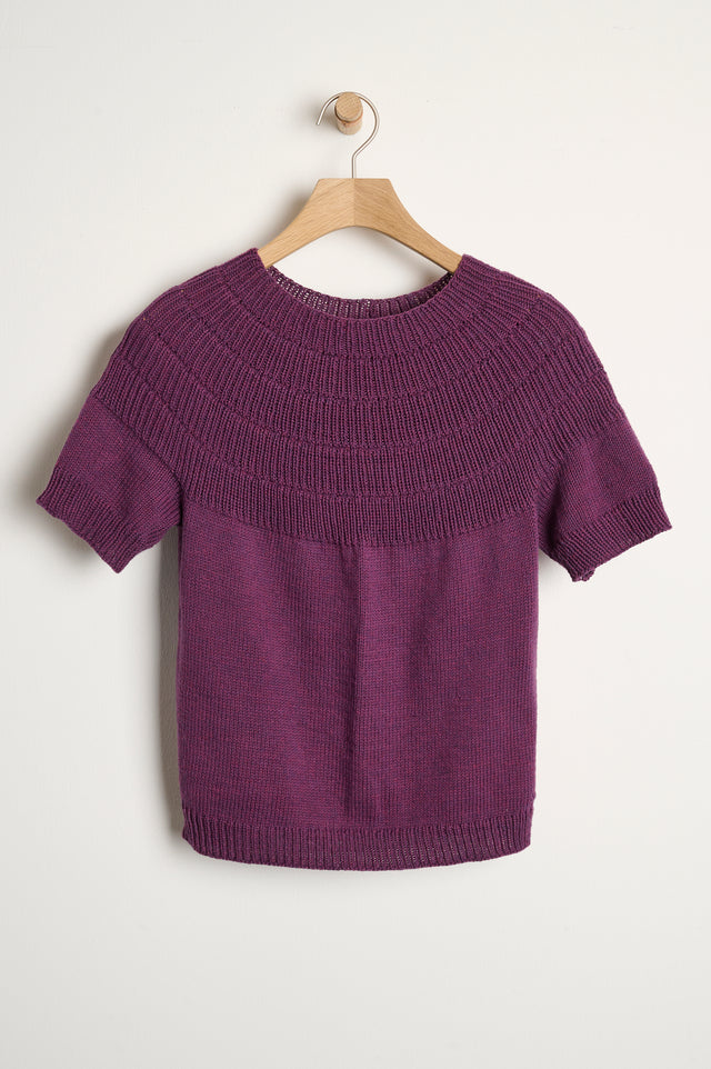 The Anker Tee by PetiteKnit is knitted top-down with a ribbed yoke and a stockinette stitch body.