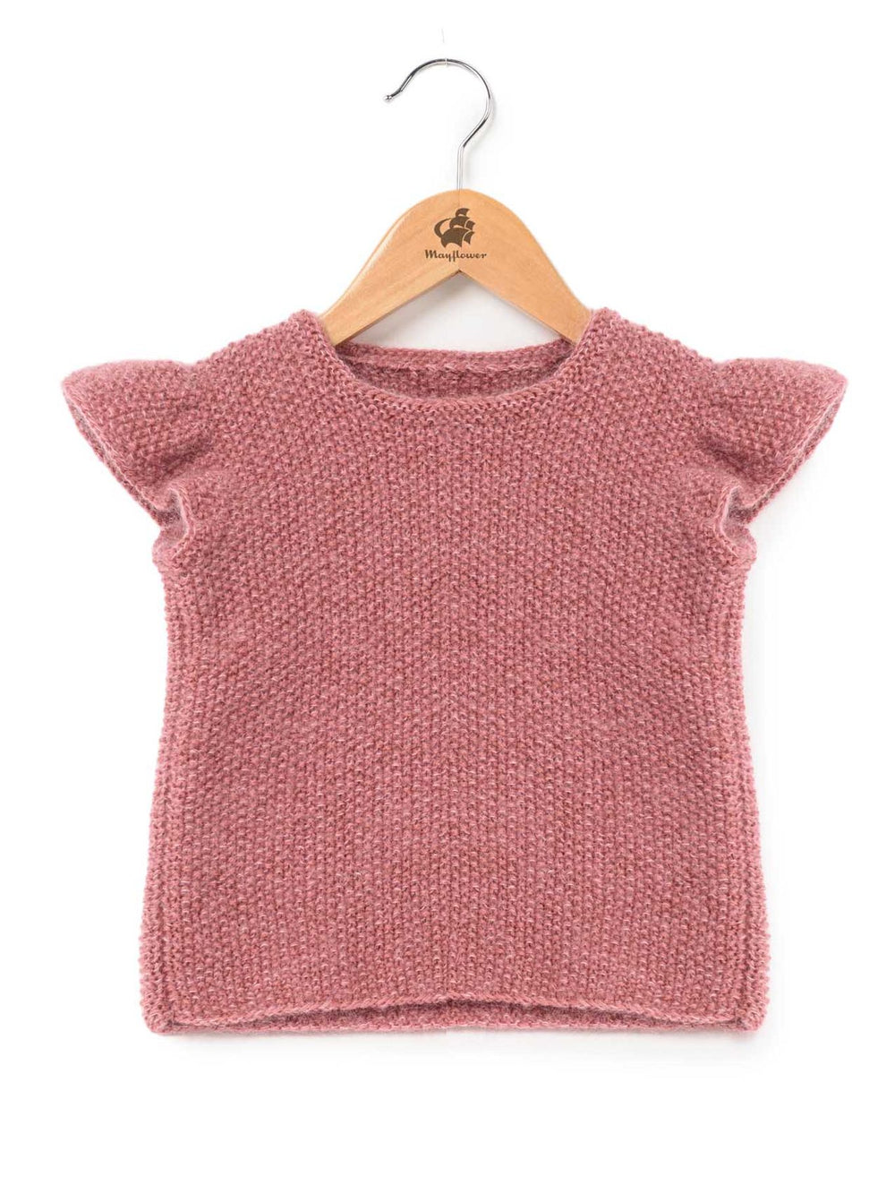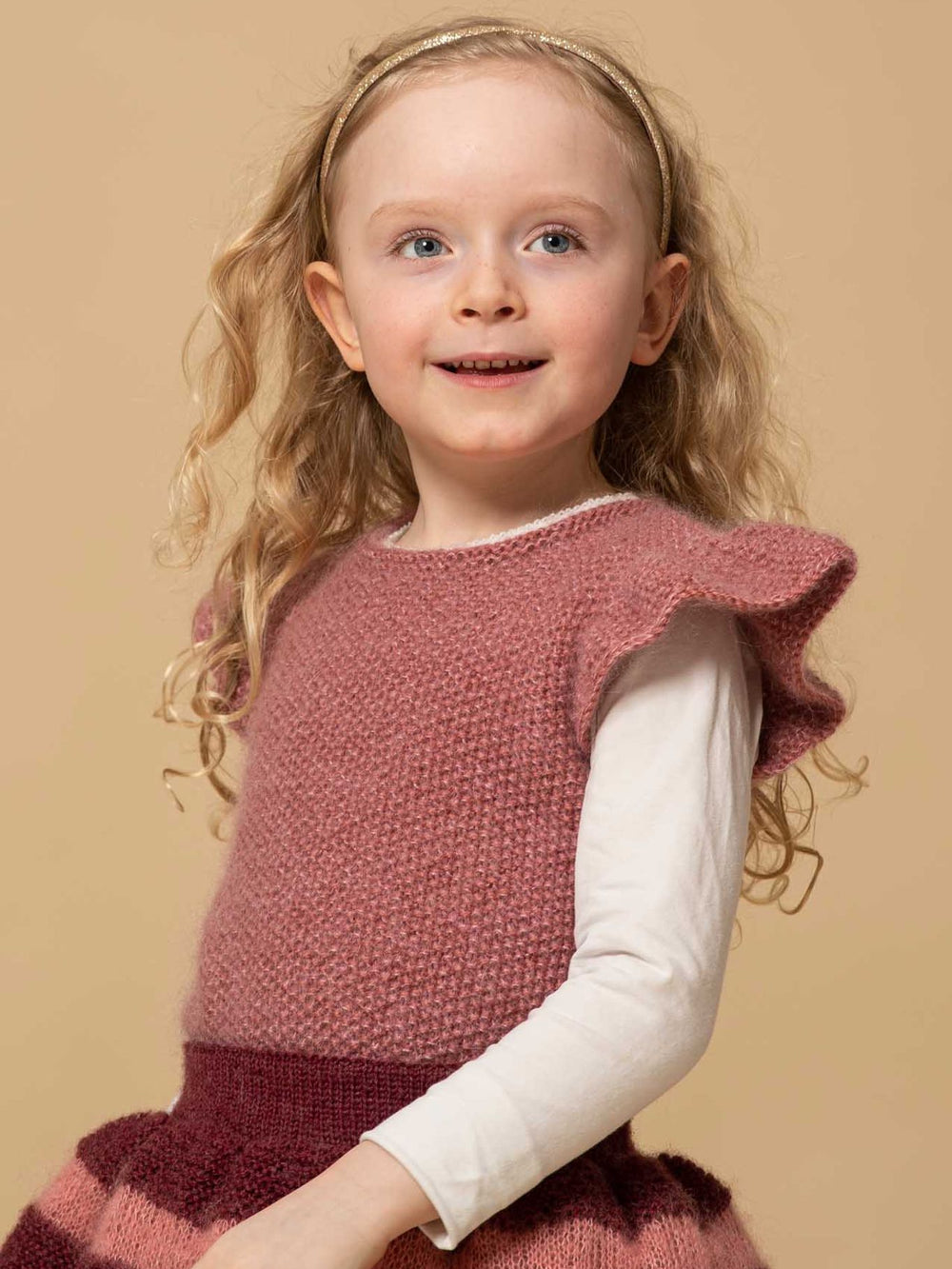 Słodkie falbany na rękawach dodają kamizelce mnóstwo charakteru, a jej prosty wzór strukturalny uzyskany dzięki ściegowi perełkowemu nadaje jej elegancki wygląd. Te urocze detale dopełnia wykończenie dekoltu, które zostało nieco nietypowo wykonane w ściegu retrilli.