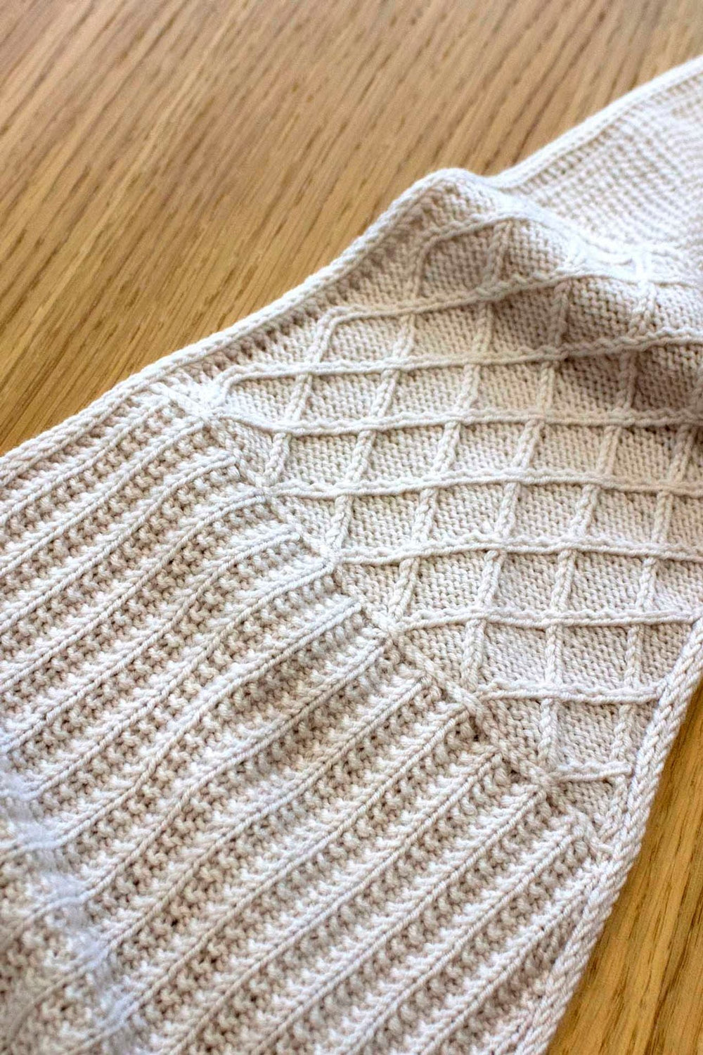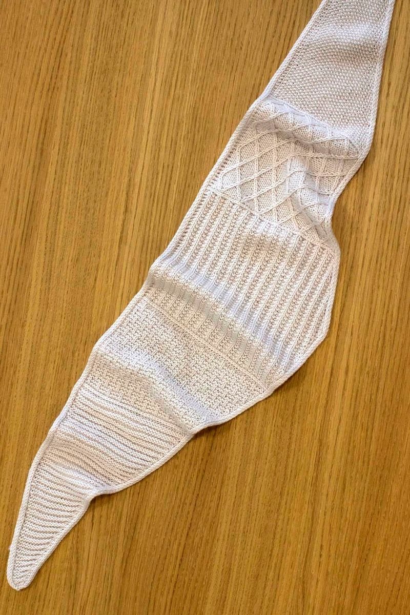 Dobre wzornictwo szalika nie kończy się na tym. Jest on dziergany w 6 różnych technikach i wzorach, co sprawia, że szalik jest naprawdę interesujący wizualnie. Zakończony jest eleganckim brzegiem i-cord. Każdy wzór jest oddzielony rzędami z pionowymi oczkami.