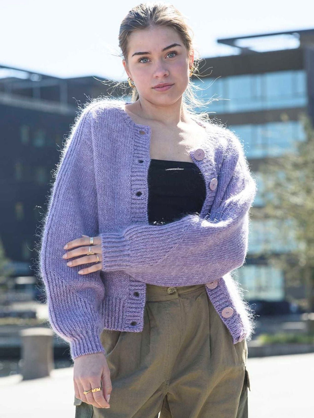 Super Kid Silk zapewnia luksusowy wygląd moheru. Połączenie obu włóczek nadaje kardiganowi wspaniałą objętość, miękkość i lekką ciężkość. Kardigan jest niezwykle wygodny w noszeniu i może być używany zarówno w chłodne zimowe dni, jak i jako alternatywa dla płaszcza przejściowego. Miłego dziergania!