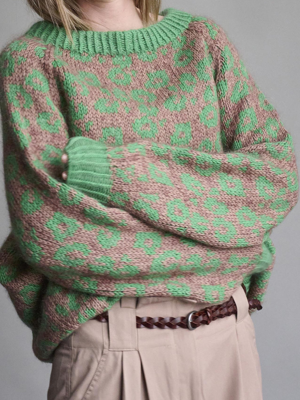 Niezwykle miękki i puszysty sweter w stylu oversize, wykonany na drutach z dwóch nitek w elegancki wzór lamparta. Sweter Chilli jest dziergany od dołu do góry: najpierw korpus, następnie rękawy, a na końcu łączy się części i wykonuje wykończenie dekoltu.