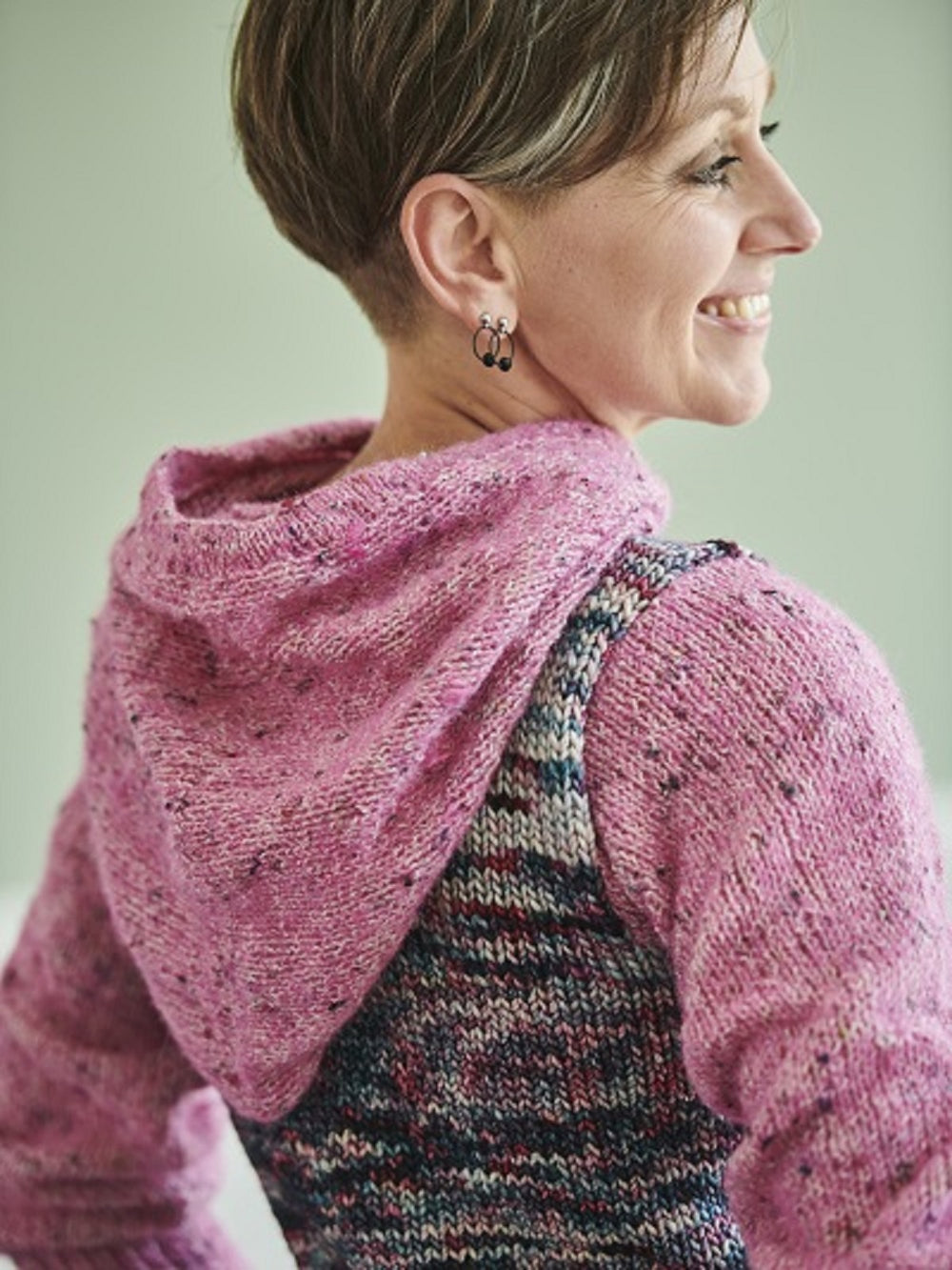 Ten sweter jest wykonany w formie kamizelki z włóczki Montreal, do której następnie dorobiono kaptur i rękawy z włóczki Casablanca Lux. Sweter ma klasyczny i sportowy wygląd, dzięki czemu jest bardzo uniwersalny. Korpus robiony jest od dołu do góry na okrągło, aż do pach, gdzie dzieli się na przód i tył, które wykonuje się osobno. Po zszyciu ramion nabiera się oczka na kaptur przy dekolcie z włóczki Casablanca Lux. Kaptur robi się według instrukcji i zszywa na górze ściegiem dziewiarskim. Następnie dorabia się przednią krawędź kaptura, która jest zawijana do wewnątrz i przyszywana. Rękaw wykonuje się na płasko, a potem zszywa, ponieważ szew pomaga zachować jego kształt, zapobiegając rozciąganiu się w czasie.