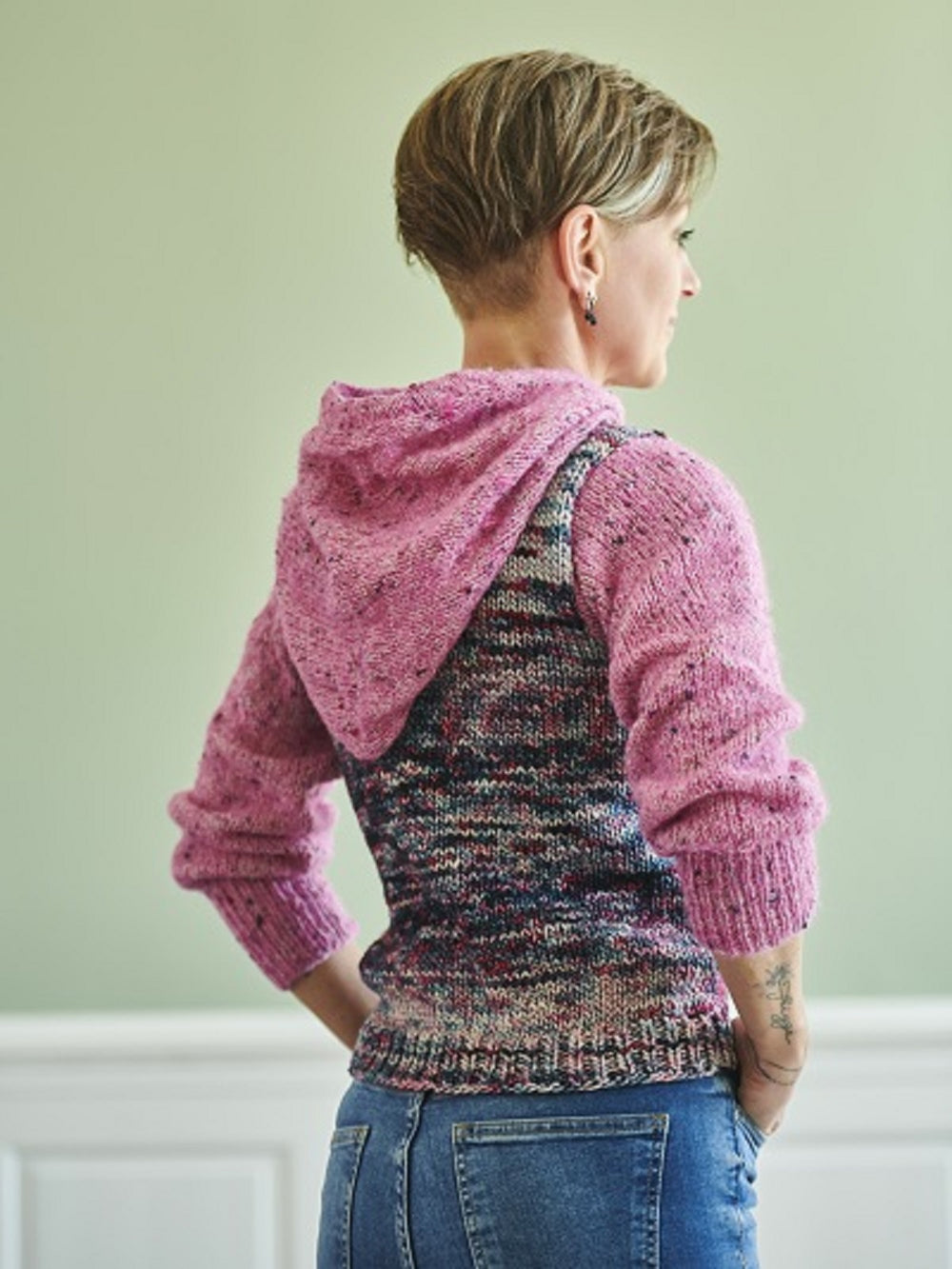 Ten sweter jest wykonany w formie kamizelki z włóczki Montreal, do której następnie dorobiono kaptur i rękawy z włóczki Casablanca Lux. Sweter ma klasyczny i sportowy wygląd, dzięki czemu jest bardzo uniwersalny. Korpus robiony jest od dołu do góry na okrągło, aż do pach, gdzie dzieli się na przód i tył, które wykonuje się osobno. Po zszyciu ramion nabiera się oczka na kaptur przy dekolcie z włóczki Casablanca Lux. Kaptur robi się według instrukcji i zszywa na górze ściegiem dziewiarskim. Następnie dorabia się przednią krawędź kaptura, która jest zawijana do wewnątrz i przyszywana. Rękaw wykonuje się na płasko, a potem zszywa, ponieważ szew pomaga zachować jego kształt, zapobiegając rozciąganiu się w czasie.