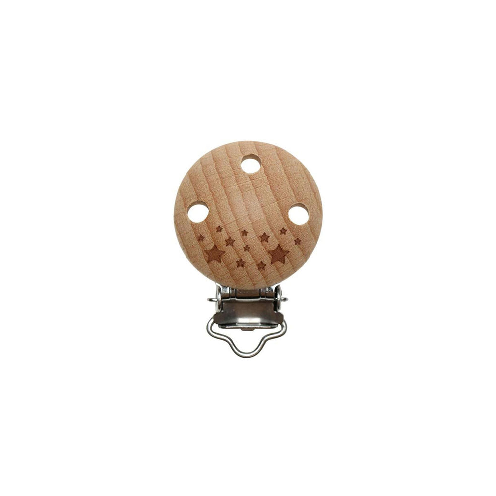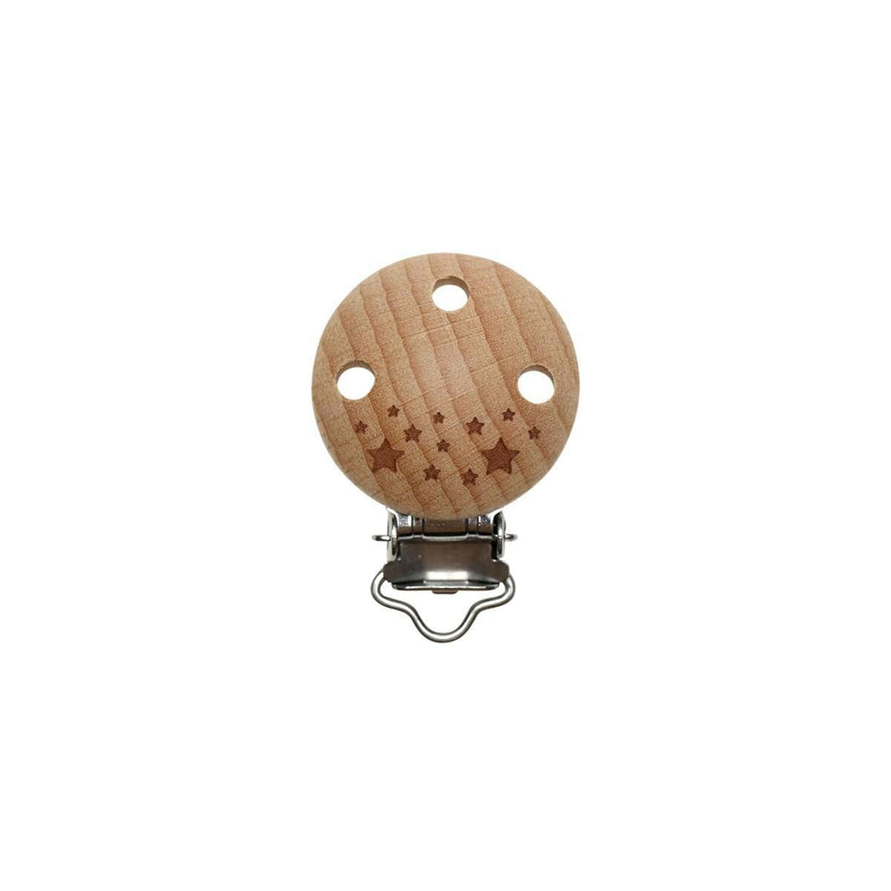 Okrągły klips do szelek wykonany z drewna, posiadający 2 otwory wentylacyjne, dzięki czemu jest zatwierdzony do użytku w łańcuszkach do smoczków. Klips ma średnicę 30 mm. Sama klamra wykonana jest z metalu i plastiku.