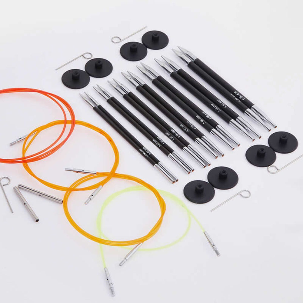 Zaletą wymiennych drutów okrągłych jest możliwość łatwej zmiany zarówno rozmiaru drutów, jak i długości żyłek. Dzięki temu nie musisz posiadać wielu różnych drutów – wystarczy ten zestaw, aby dostosować druty do potrzeb Twojego projektu.