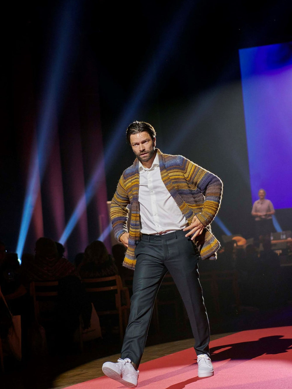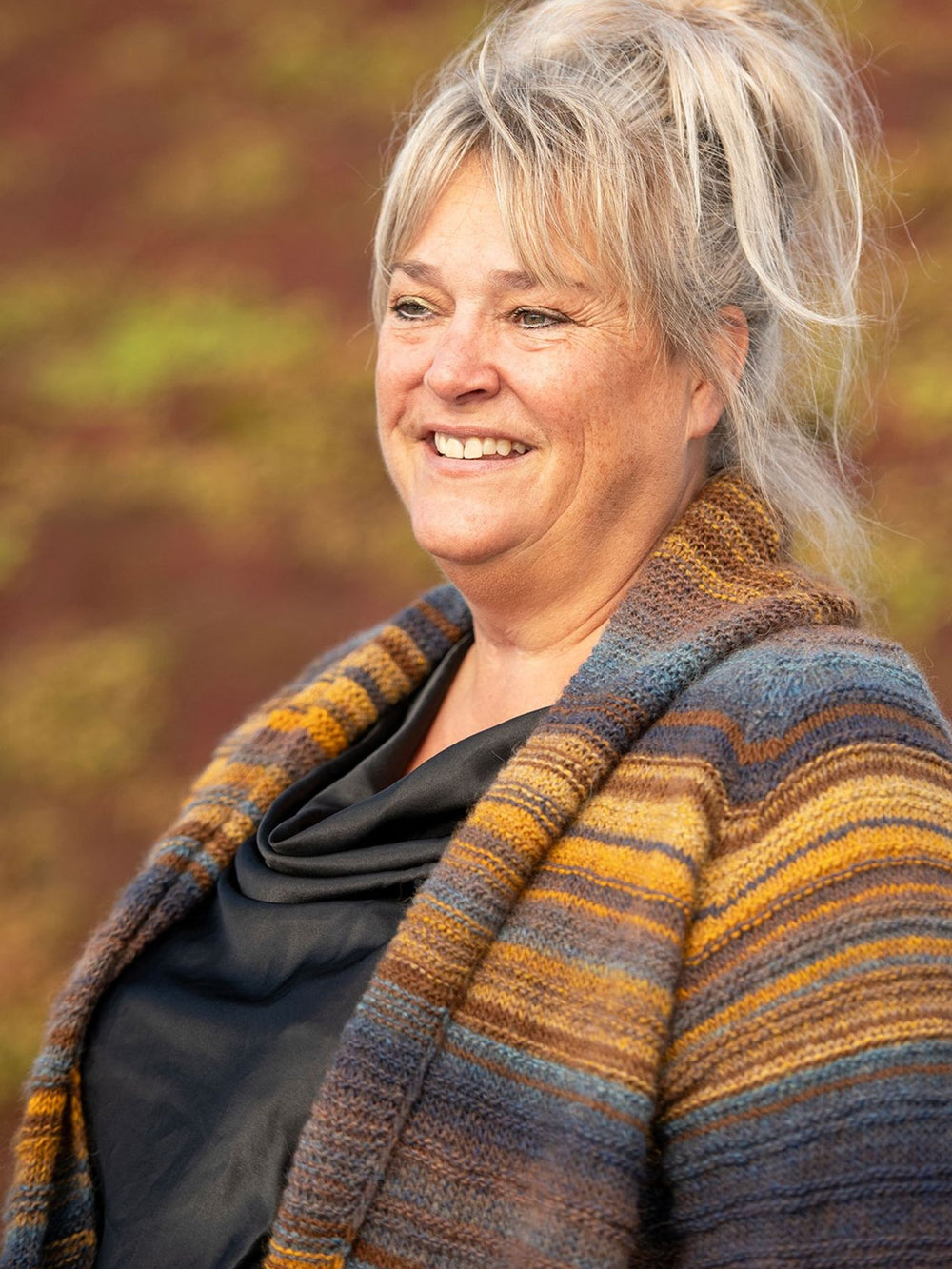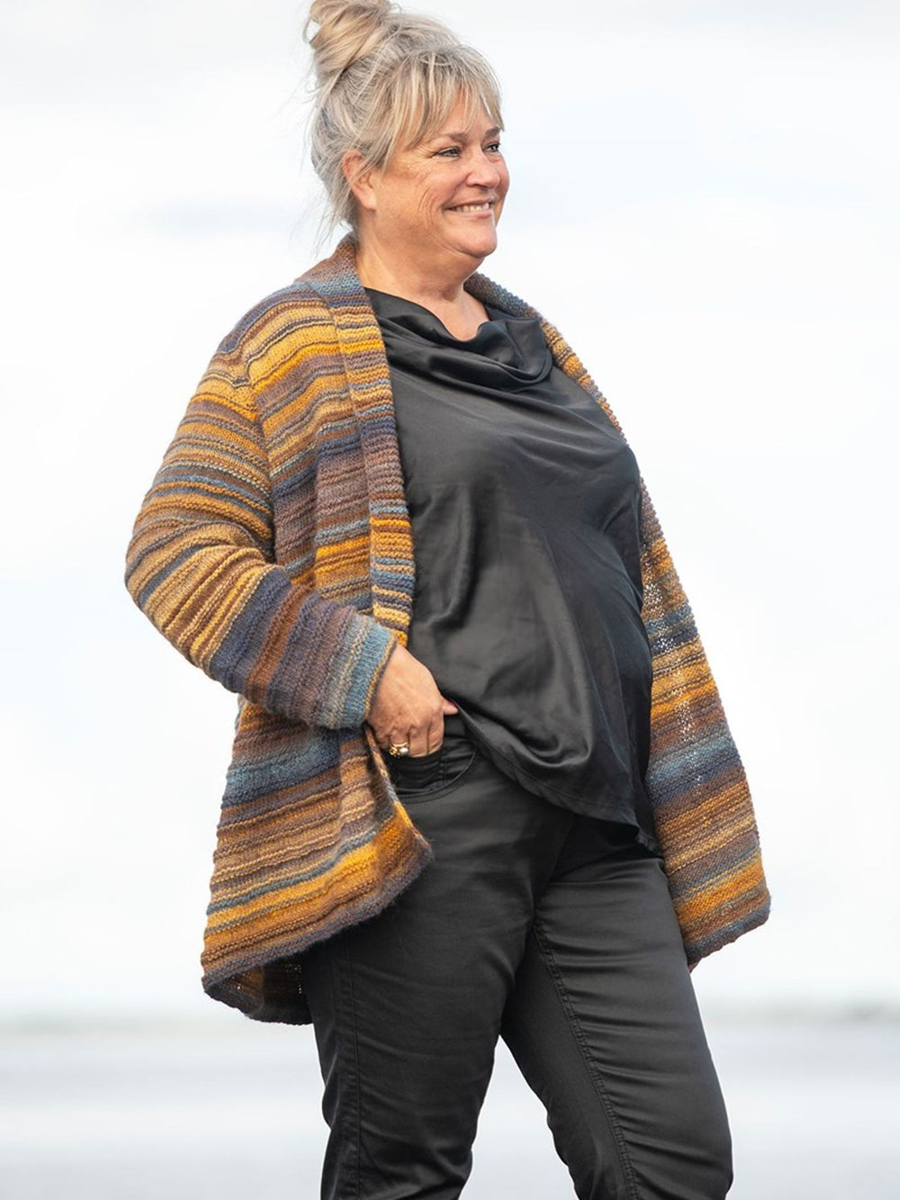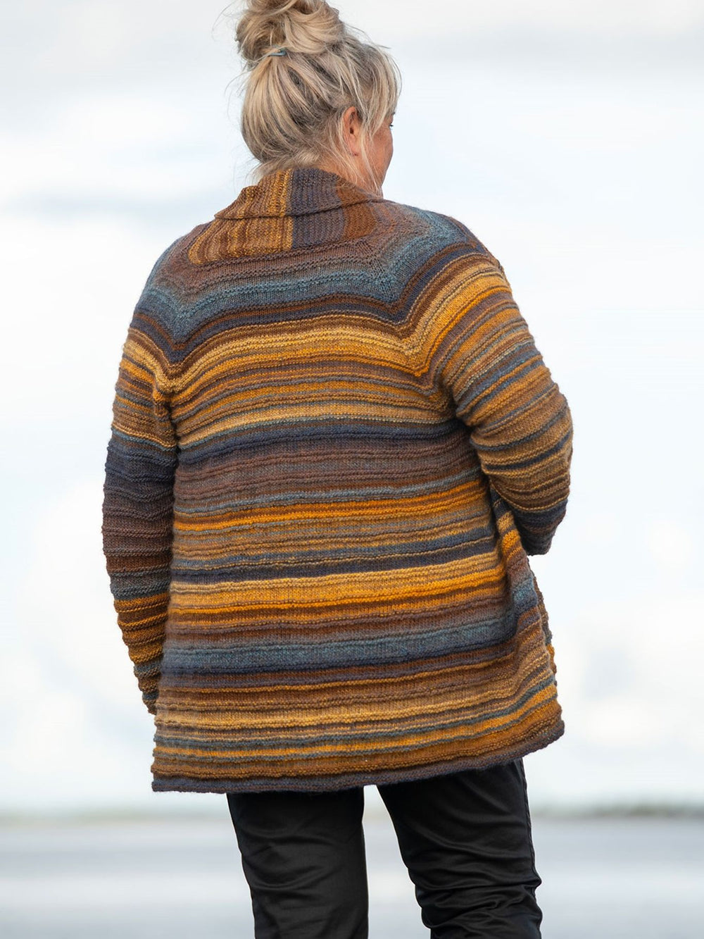 Pasiasty wzór kolorystyczny powstaje sam z siebie, ponieważ kardigan jest dziergany z włóczki Mayflower Taormina, która posiada długą sekwencję kolorystyczną składającą się z wąskich i szerokich pasków w dopasowanych kolorach. Dzięki temu dzierganie z Taorminy to prawdziwa przyjemność – miło obserwować, jak kolory układają się w unikalny wzór, a sama włóczka jest bardzo przyjemna w dotyku.