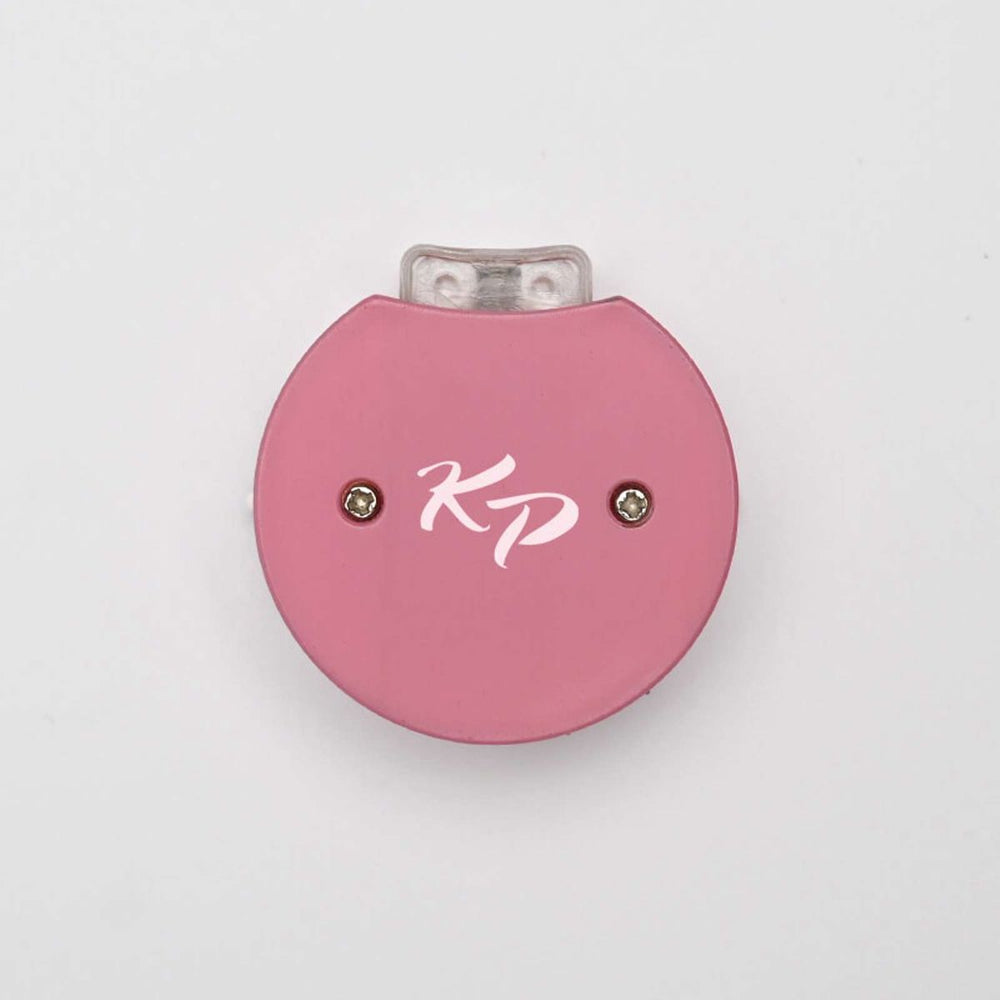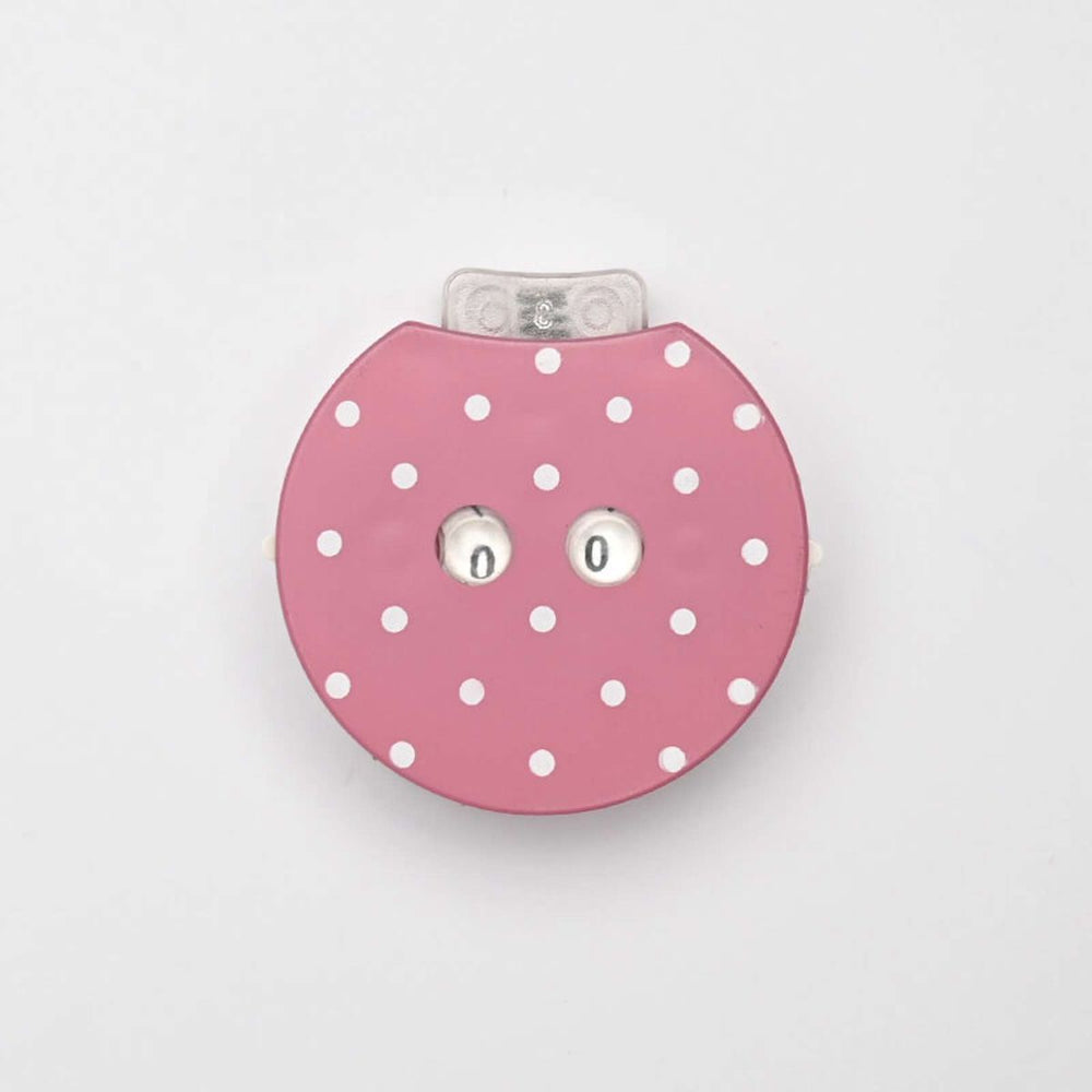 Licznik rzędów od KnitPro, który pomaga śledzić postępy w pracy na drutach lub szydełku. Licznik zmienia liczby rzędu, drutów lub okrążeń przez naciśnięcie na górze. Licznik jest w pięknym, różowym kolorze w białe kropki.