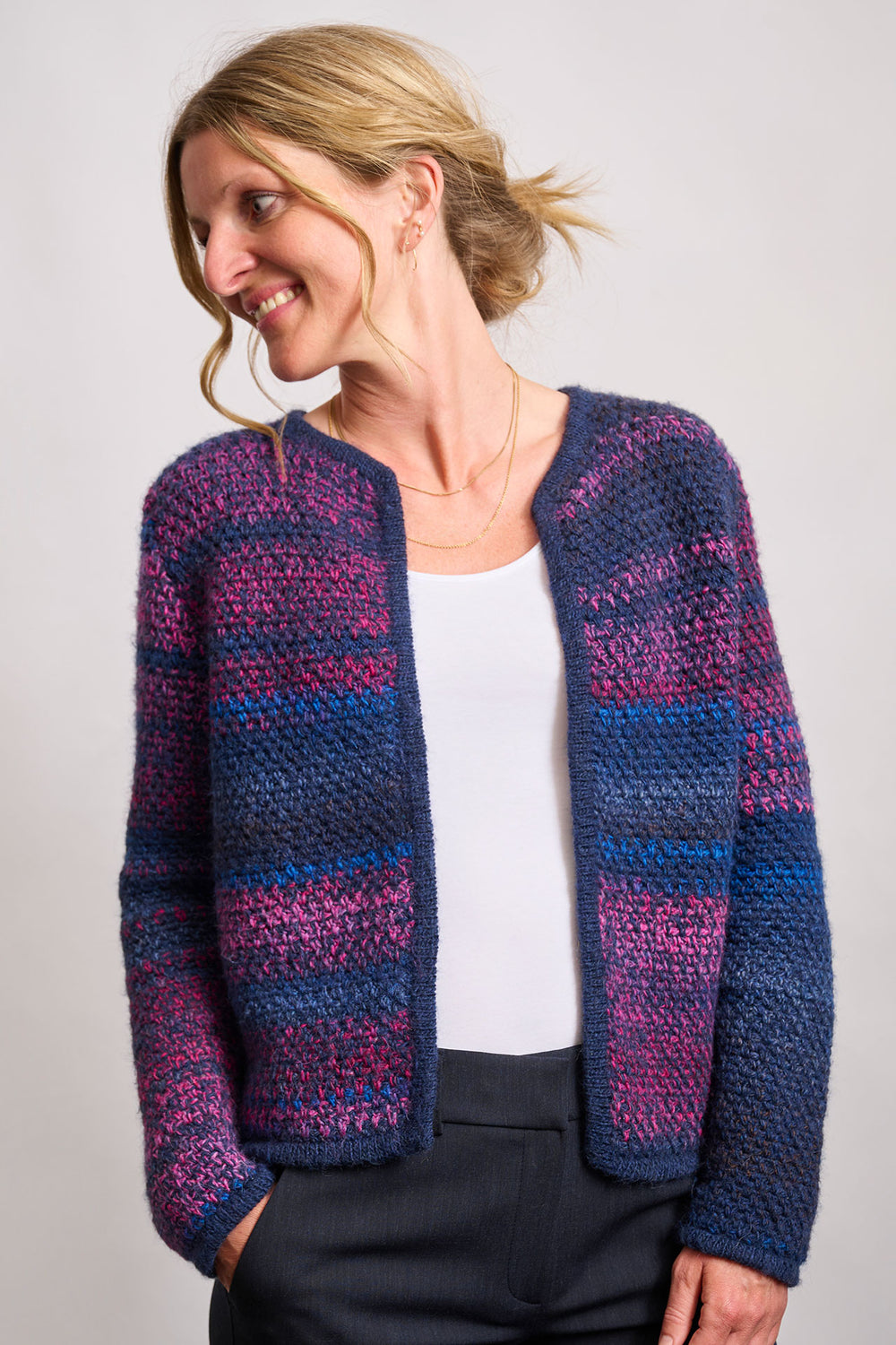 Krótka i klasyczna szydełkowana marynarka, która stanowi idealne wykończenie stylizacji, gdy chcesz wyglądać nieco bardziej elegancko. Marynarka wykonana jest we wzorze z dwóch nitek (1 nitka z każdej jakości włóczki), natomiast brzegi są robione na drutach. Tył i przody są robione i szydełkowane razem aż do pach, a następnie poszczególne części są kończone osobno. Ramiona są zszywane szydełkiem, a rękawy są robione oddzielnie i doszywane na końcu.