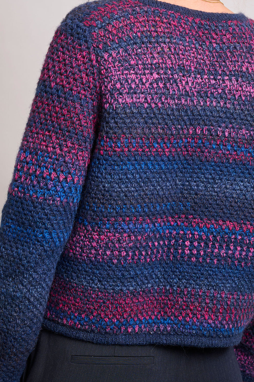 Marynarka została wykonana z połączenia jednokolorowej włóczki Mayflower Taormina Shade oraz Taorminy z pięknymi przejściami kolorystycznymi. Obie przędzy mają taką samą jakość – to mieszanka alpaki, która jest wyjątkowo miękka i lekko puszysta. Ten model znajdziesz także w wersji w stylu Chanel w innych rodzajach przędzy od Mayflower, m.in. Mayflower Premium Athena i Mayflower Birmingham. Marynarkę należy prać ręcznie w specjalnym płynie do wełny.