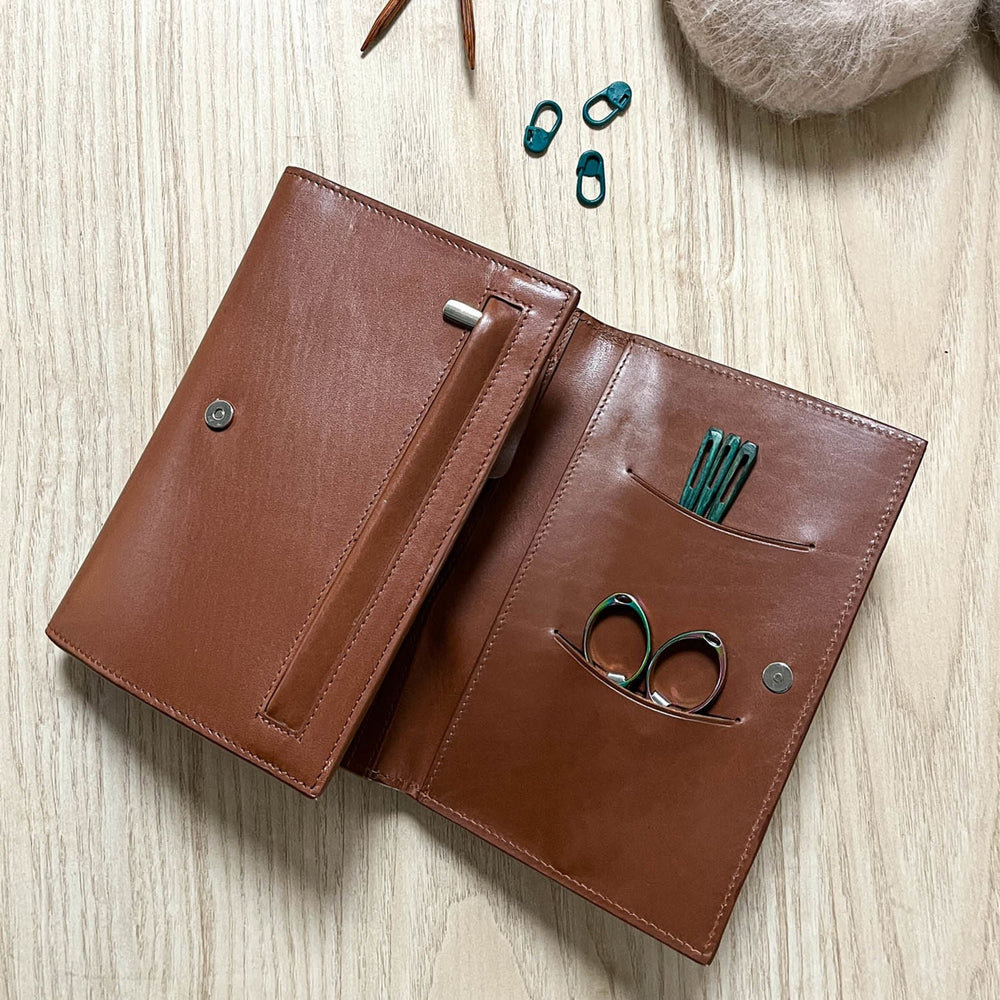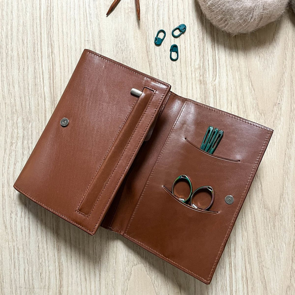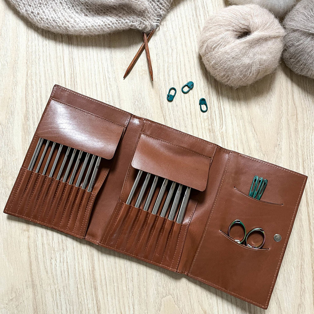 Mayflower skórzane etui na druty, kolor koniakowy jest zamówiony ponownie i wysyłany, gdy tylko będzie na stanie magazynu.