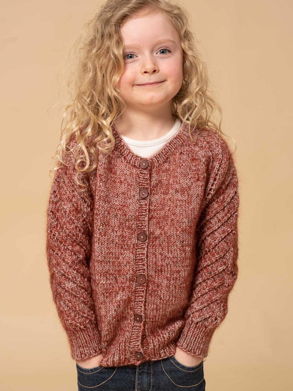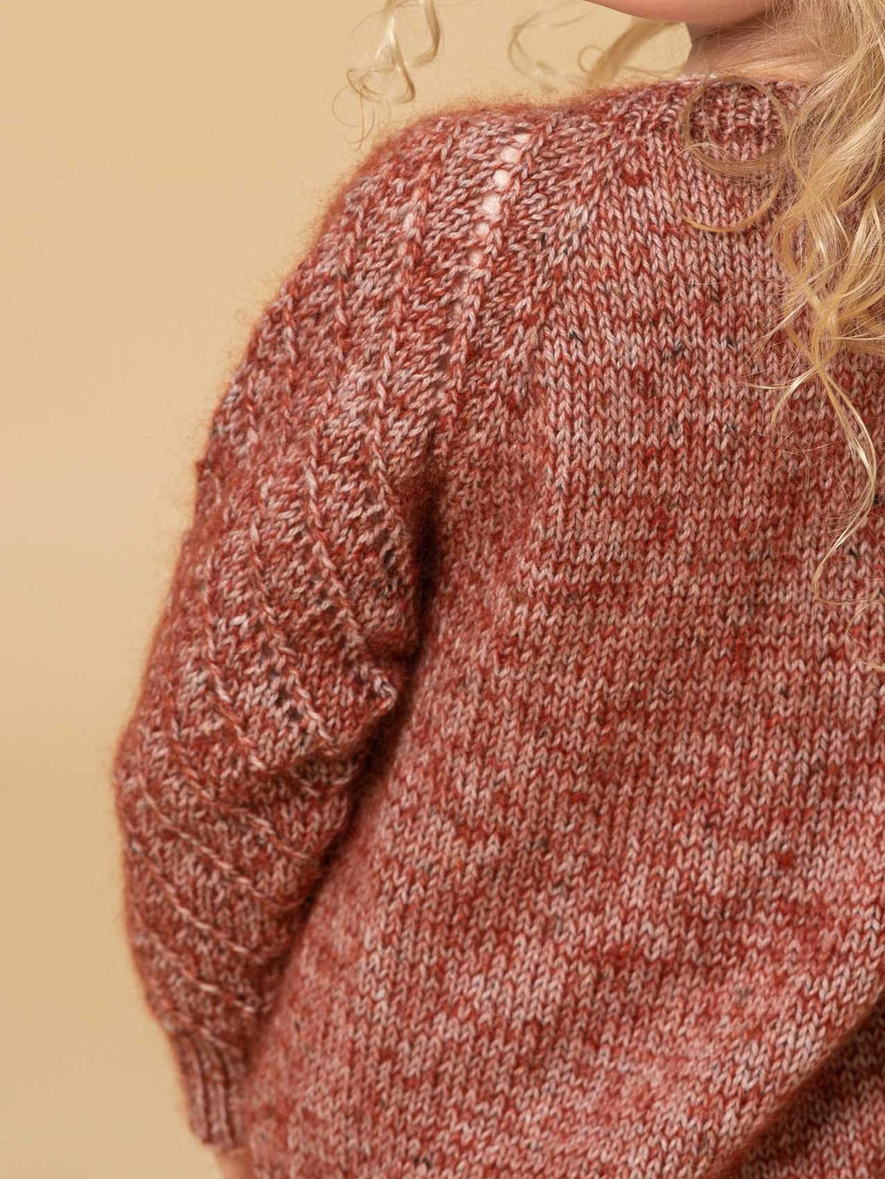 Ten wzór został zaprojektowany z użyciem jednej nitki Easy Care Tweed oraz jednej nitki Super Kid Silk. Połączenie tych dwóch rodzajów włóczki tworzy idealną, miękką strukturę, która pięknie podkreśla ażurowy wzór na rękawach. Sweterek dzierga się z rękawami raglanowymi, co oznacza, że nie trzeba go zszywać. Wzór jest dość prosty, o ile masz doświadczenie z dzierganiem ażurowych motywów.