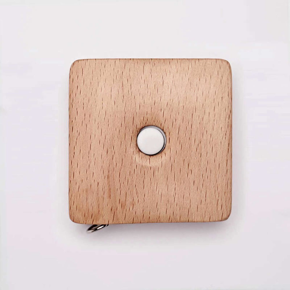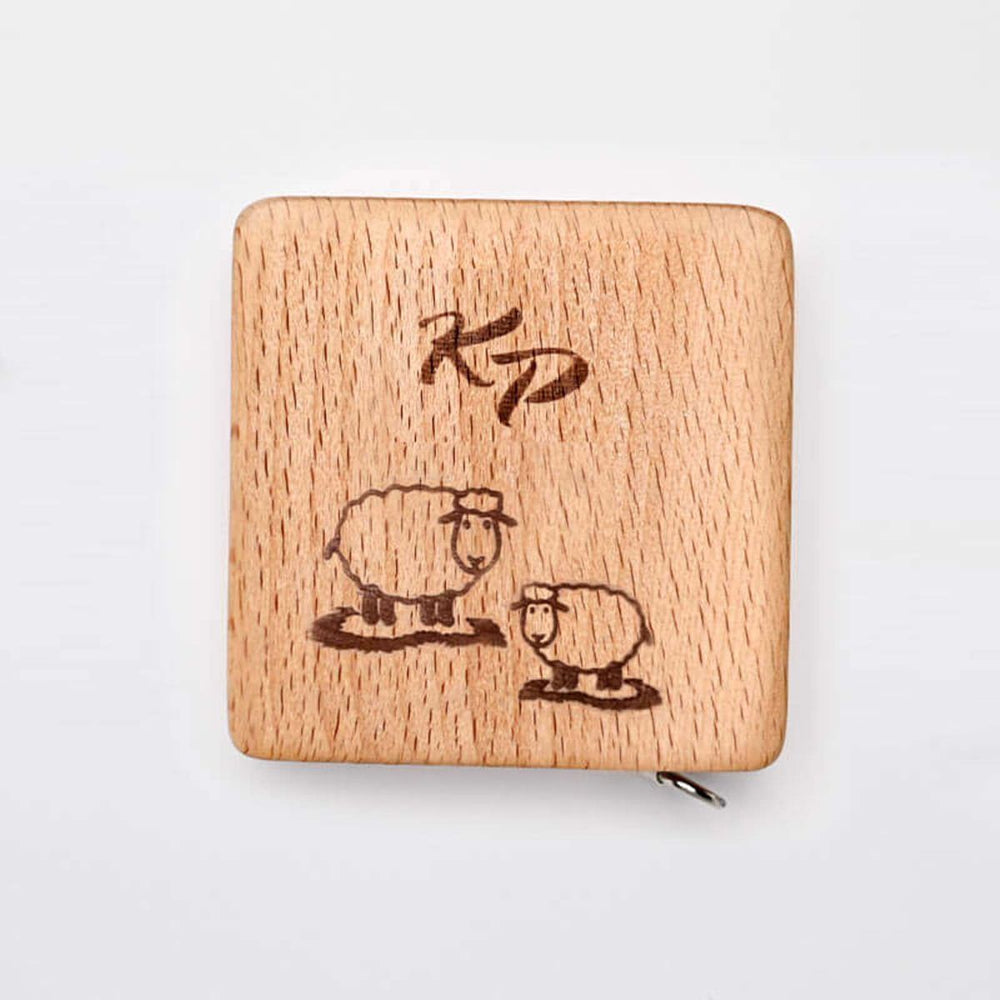 Miarka od KnitPro w pięknej, kwadratowej drewnianej obudowie. Miarka ma długość 150 cm. Rozwijasz ją, pociągając za miarkę, a zwijasz z powrotem, naciskając na środek kwiatka z przodu obudowy.