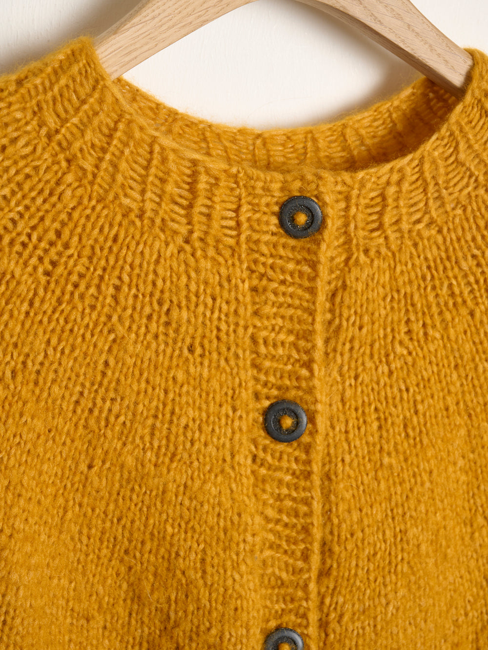 Note: The photos show two different colors of the same sweater. The bottom ribbing on the mustard version is longer than on the gray one.