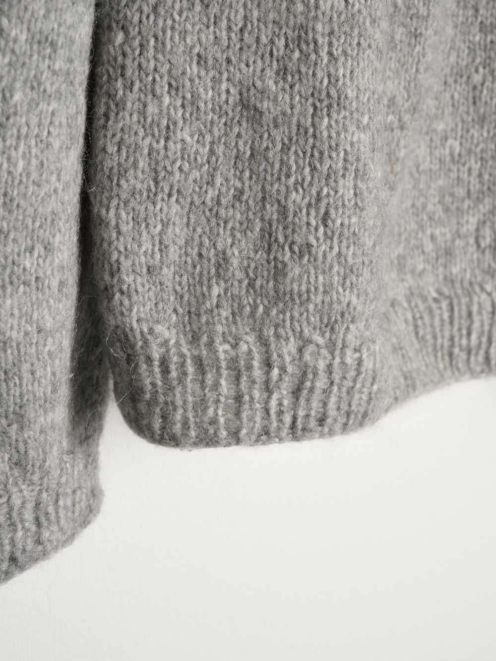 Note: The photos show two different colors of the same sweater. The bottom ribbing on the mustard version is longer than on the gray one.