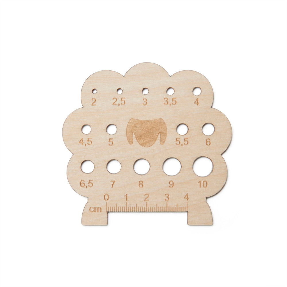 Miarka do drutów wykonana z drewna, w kształcie owcy. Z tą miarką do drutów możesz łatwo i szybko sprawdzić, jaki rozmiar mają Twoje druty. Miarka pozwala na mierzenie drutów o rozmiarze od 2,0 mm do 10,0 mm. Jeśli nie możesz przełożyć drutu przez otwór, spróbuj większego, aż znajdziesz odpowiedni rozmiar.