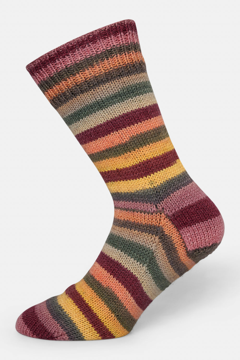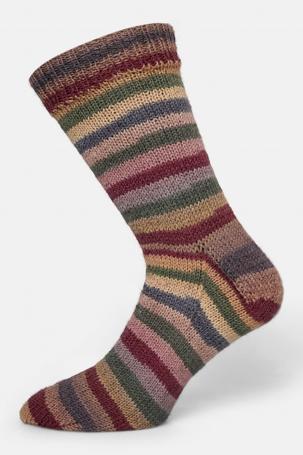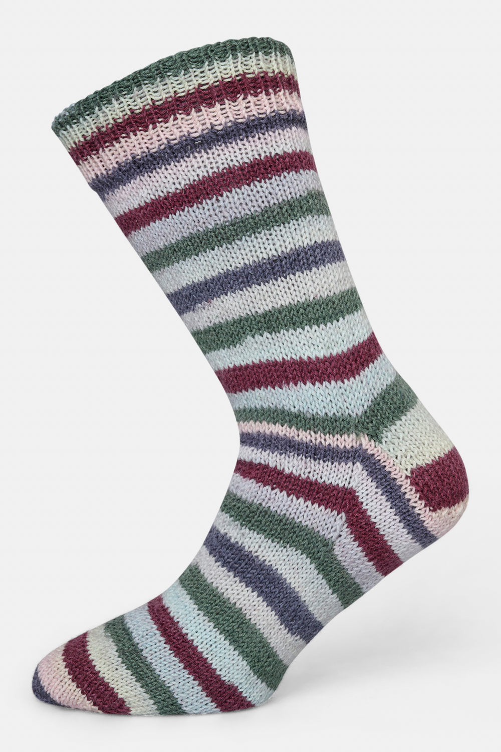 Skarpety zostały wykonane z wspaniałej włóczki skarpetkowej Mayflower Premium Sock Wool Ocean, która składa się w 75% z ciepłej wełny i w 25% z wytrzymałego poliamidu. Miękka wełna zapewnia ciepło stopom, a poliamid dodaje wytrzymałości, co sprawia, że skarpety mogą służyć przez wiele lat. Innymi słowy, Premium Sock Wool to włóczka skarpetkowa o bardzo wysokiej jakości. Seria Ocean nadaje skarpetom pasiasty wzór.