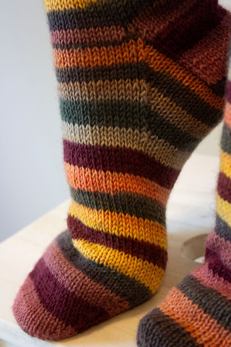 Klasyczne i proste, a zarazem piękne skarpety z klinową piętą. Skarpety są wykonane w ściegu gładkim z ściągaczem na górze. Dzięki ściegowi gładkiemu możesz szybko wykonać cholewkę i podeszwę, a wzór dokładnie poprowadzi Cię przez wykonanie pięty i palców. Efektem końcowym jest para pięknych i wygodnych skarpet z eleganckim, pasiastym wzorem.