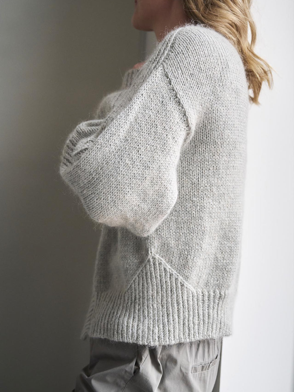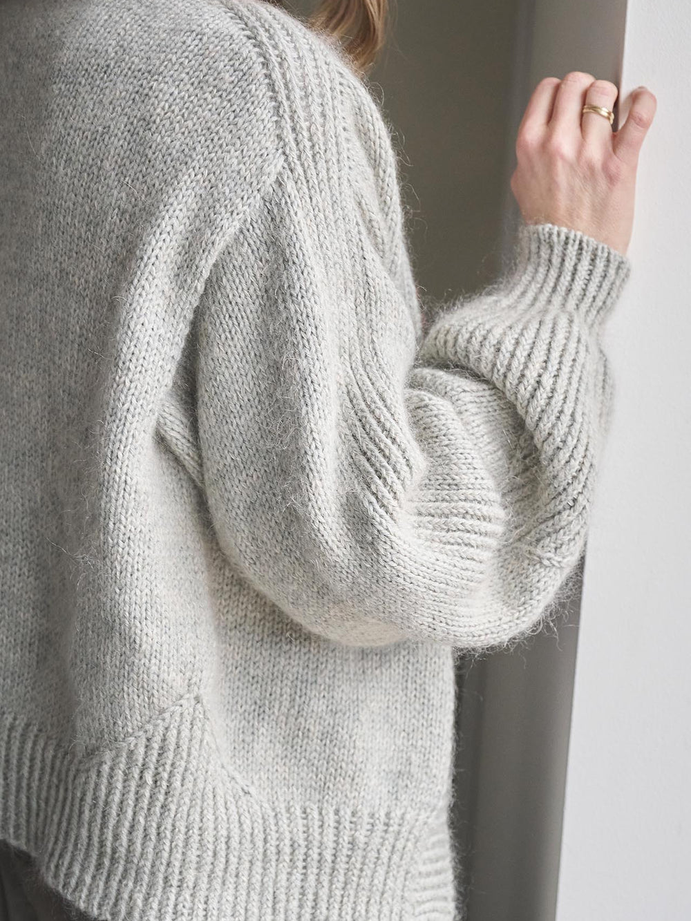 Puszysta i miękka struktura kardiganu pochodzi od włóczki, gdyż jest dziergany z jednej nitki Mayflower Easy Care Classic i jednej nitki Mayflower Super Kid Silk. Easy Care Classic to średnia grubość w serii miękkich i wełnianych włóczek Easy Care, a tweedowe nitki dodają włóczce i gotowemu kardiganowi nieco dodatkowego wyrazu i piękny melanżowy odcień.