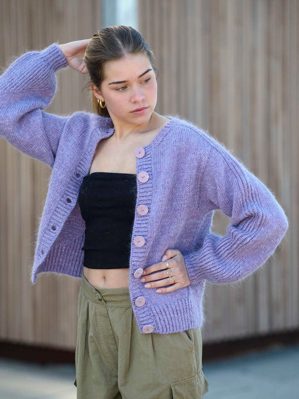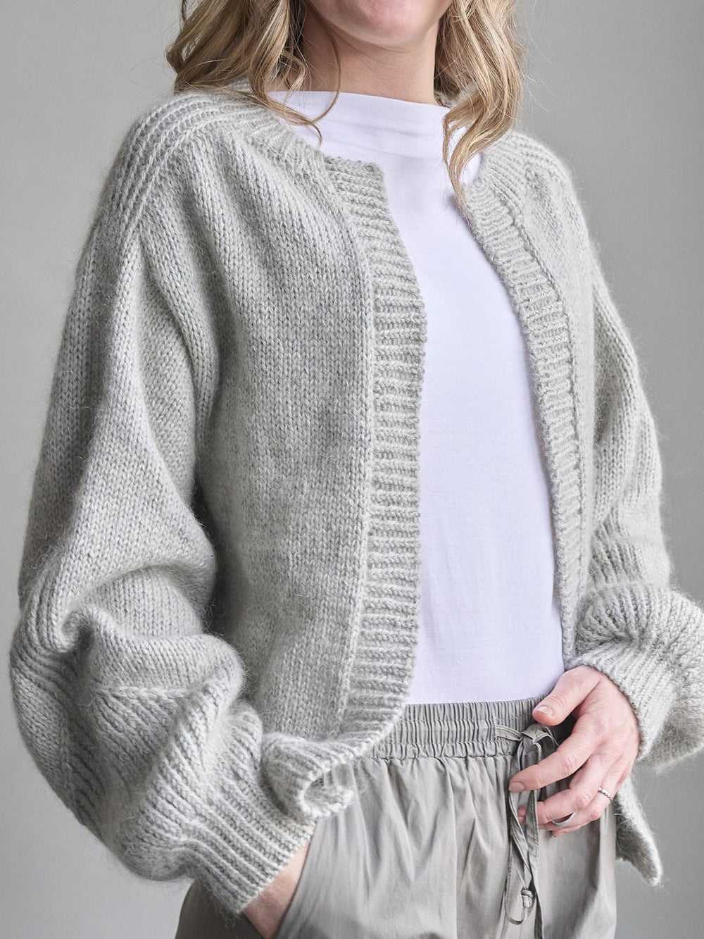 Super Kid Silk zapewnia luksusowy wygląd moheru. Połączenie obu włóczek nadaje kardiganowi wspaniałą objętość, miękkość i lekką ciężkość. Kardigan jest niezwykle wygodny w noszeniu i może być używany zarówno w chłodne zimowe dni, jak i jako alternatywa dla płaszcza przejściowego. Miłego dziergania!