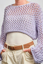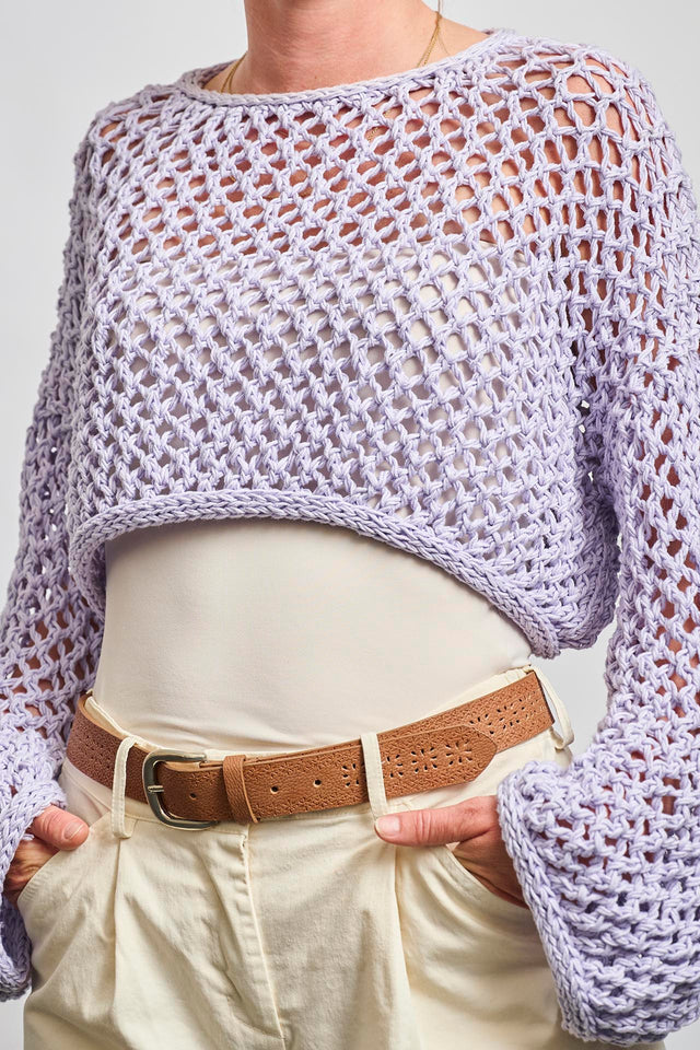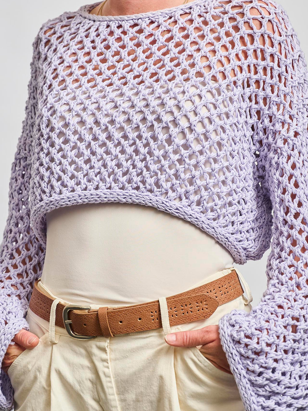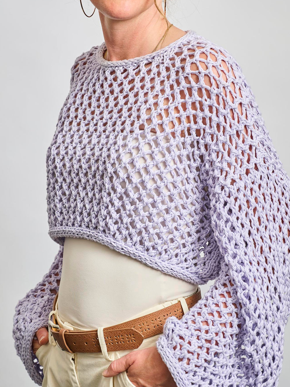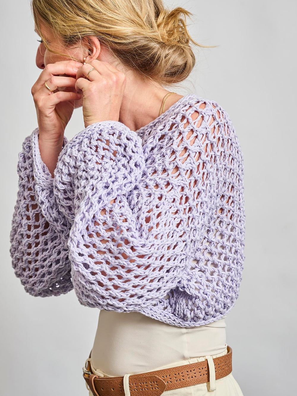 Bluzka na drutach wykonana w przewiewnym wzorze siateczkowym. Ma luźny krój w górnej części oraz na wysokości biustu, a także szerokie rękawy. Dzięki temu jej design jest niezwykle lekki i zwiewny. Bluzka jest robiona od góry do dołu.