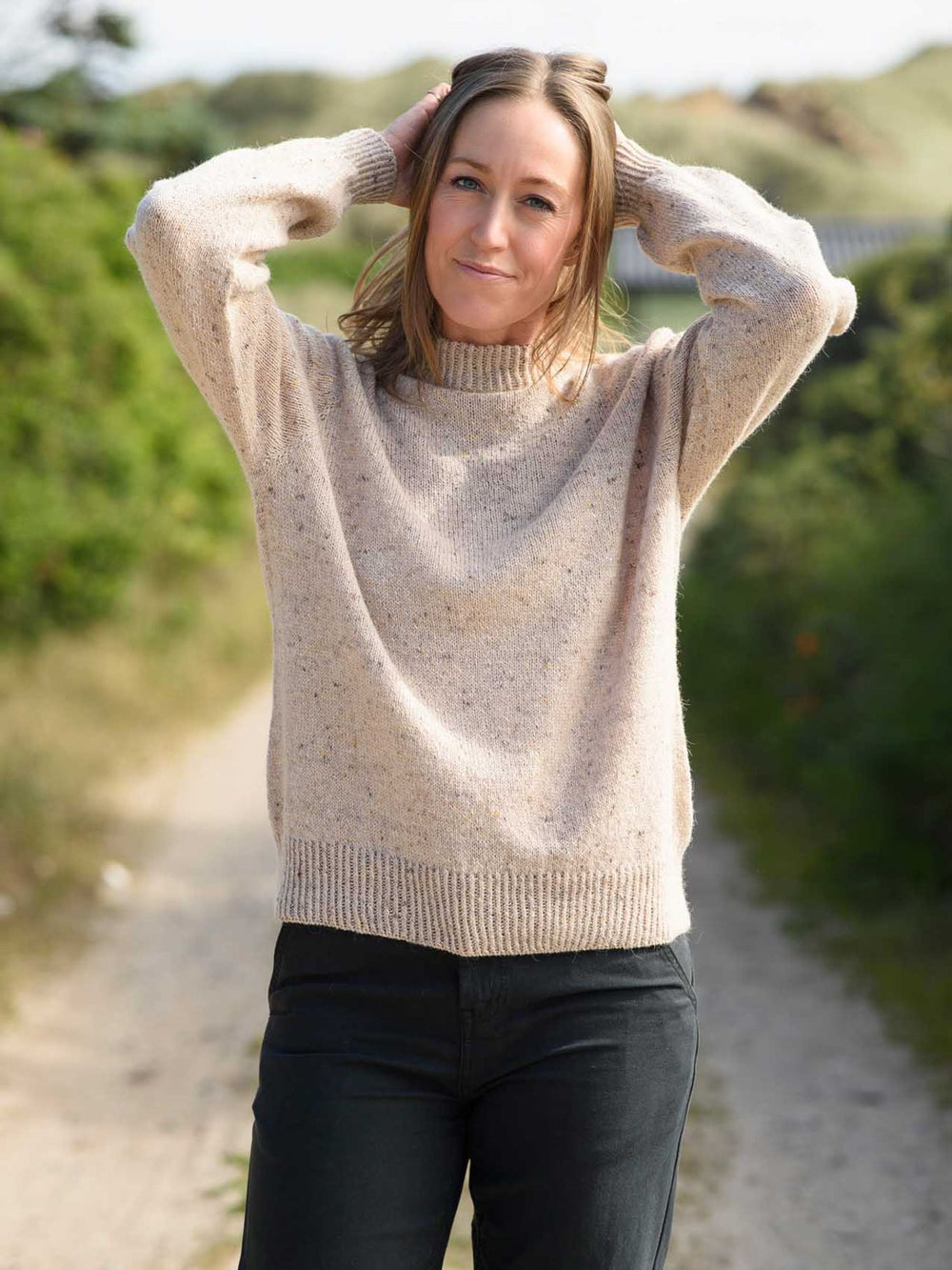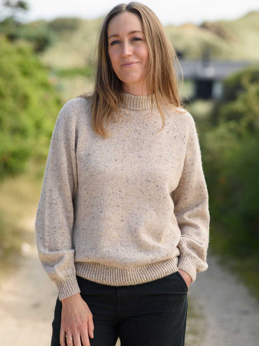 Sweter Skørping jest dziergany z wyjątkowej, wełnianej włóczki Mayflower Birmingham. To doskonała jakość włóczki, zawierająca m.in. wełnę z alpaki, z pięknymi tweedowymi kropkami, które są dopasowane kolorystycznie do odcieni włóczki. Mimo że włóczka jest cienka i delikatna, jej skład włókien sprawia, że jest ciepła, miękka, trwała i regulująca temperaturę. Dzięki temu Sweter Skørping to klasyczny sweter, który można nosić przez cały rok, jest bardzo wygodny w noszeniu i prezentuje się świetnie w pięknych tweedowych kolorach.