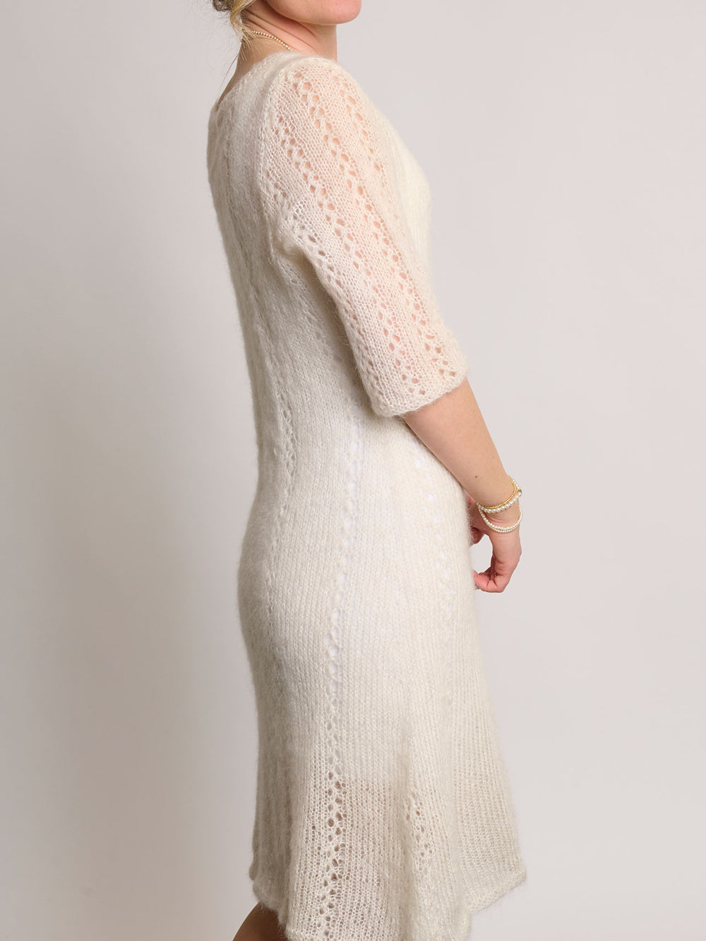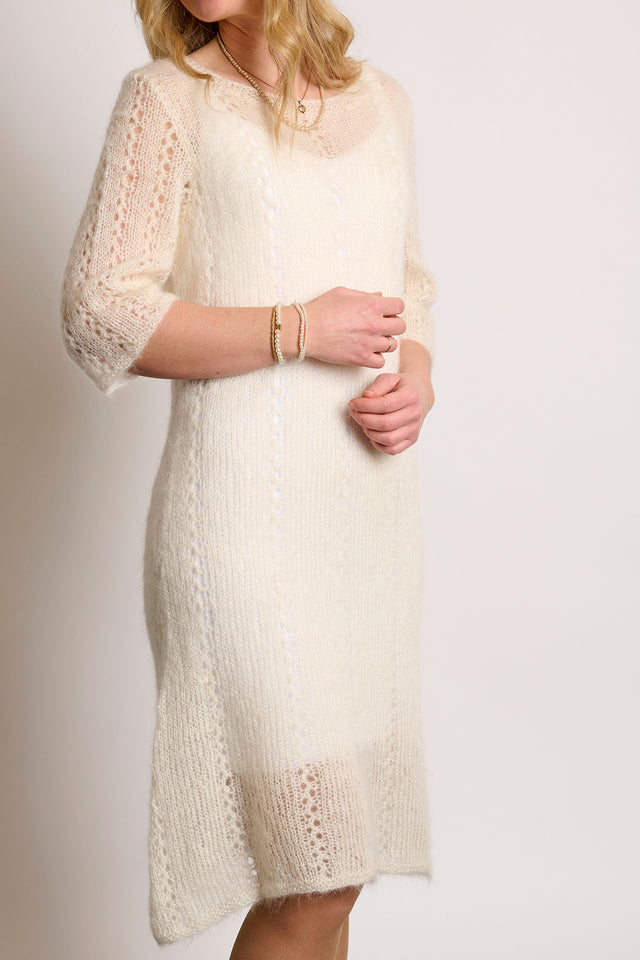 Sukienka jest robiona z lekkiej włóczki Mayflower Super Kid Silk, która dostępna jest w wielu kolorach.