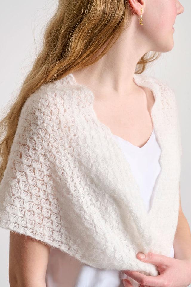 Piękny, trójkątny szal, który jest szydełkowany z eleganckim wzorem ażurowym. Ten subtelny i ekskluzywny szal ma piękny, połyskujący wygląd, ponieważ jest wykonany z błyszczącej włóczki Mayflower Anyday Diva. To naprawdę miękka przędza, spleciona z wiskozy i wełny.