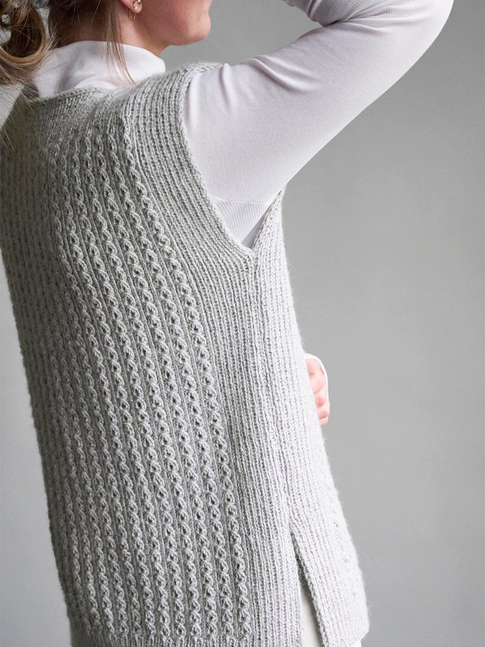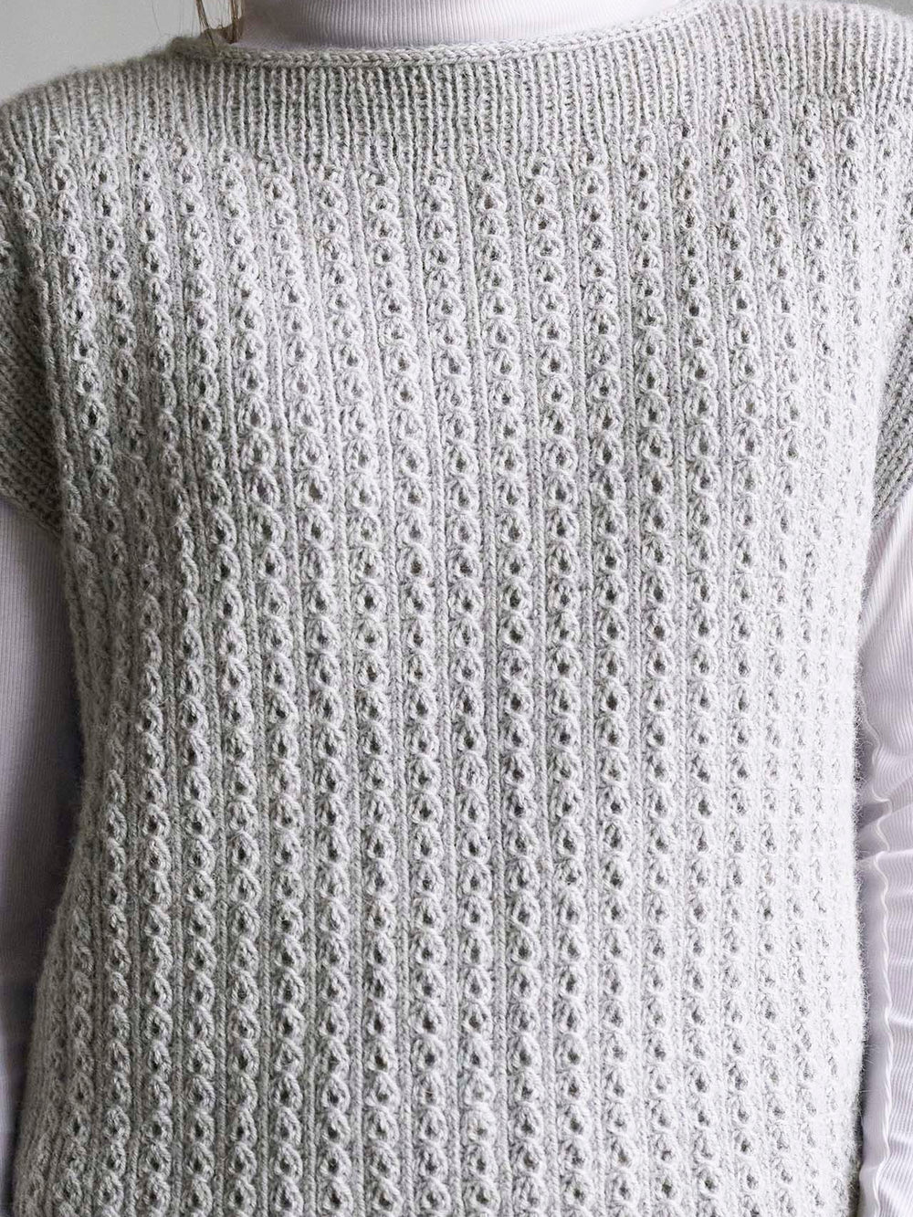 Elegancka kamizelka z ażurowym wzorem, która jest łatwa do wykonania dzięki prostej konstrukcji. Kamizelka Sigrid ma świetne dopasowanie i ładnie układa się na ramionach. Kamizelkę robi się od góry do dołu, zaczynając od łańcuszka oczek łańcuszkowych, na którym kontynuuje się robótkę. Najpierw wykonuje się tył, potem przód, następnie krawędź dekoltu, a na końcu zszywa się boki kamizelki. Wzór dostępny jest w rozmiarach od XS do 3XL.