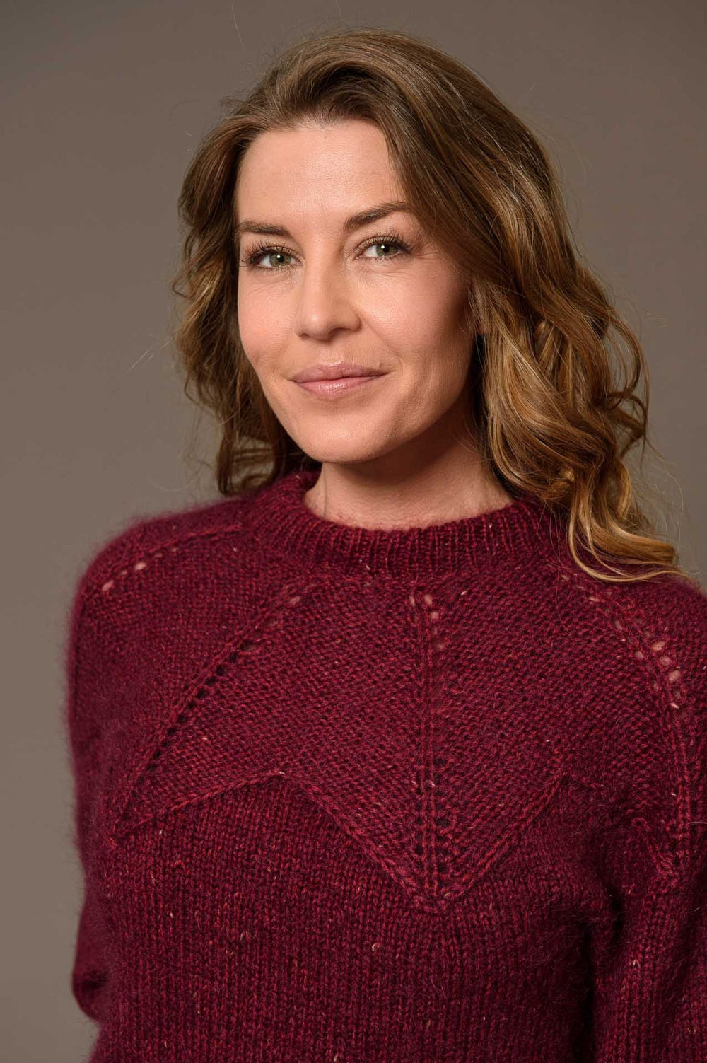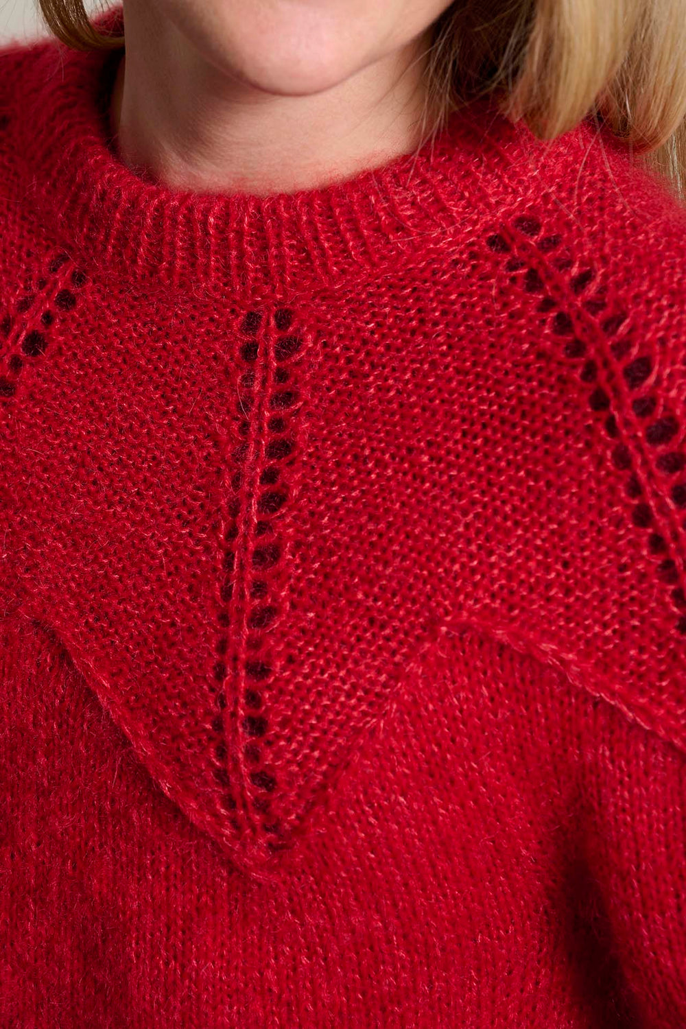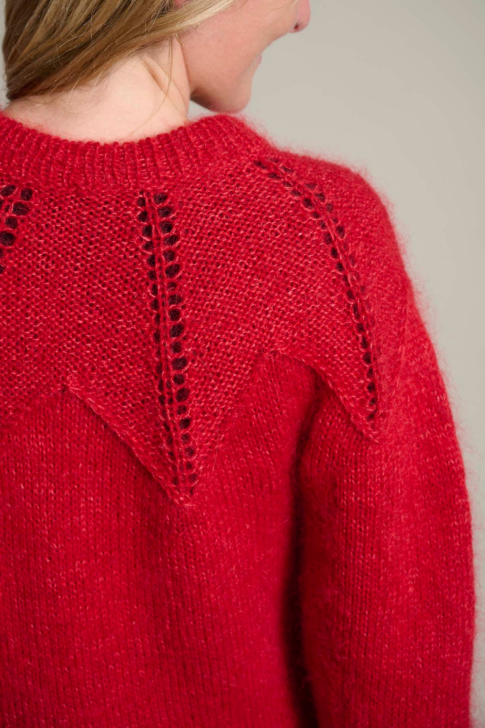 Sweter jest dziergany od góry do dołu, a dodawanie oczek jest wykonywane za pomocą regularnego ażuru, co tworzy iluzję kwiatka w kształcie gwiazdy. Kwiat jest dodatkowo podkreślony piękną krawędzią ze ściegów skręconych, która tworzy granicę między karczkiem a resztą bluzki. Dla większego kontrastu karczek jest wykonany ściegiem odwrotnym, podczas gdy reszta swetra jest dziergana gładkim ściegiem.